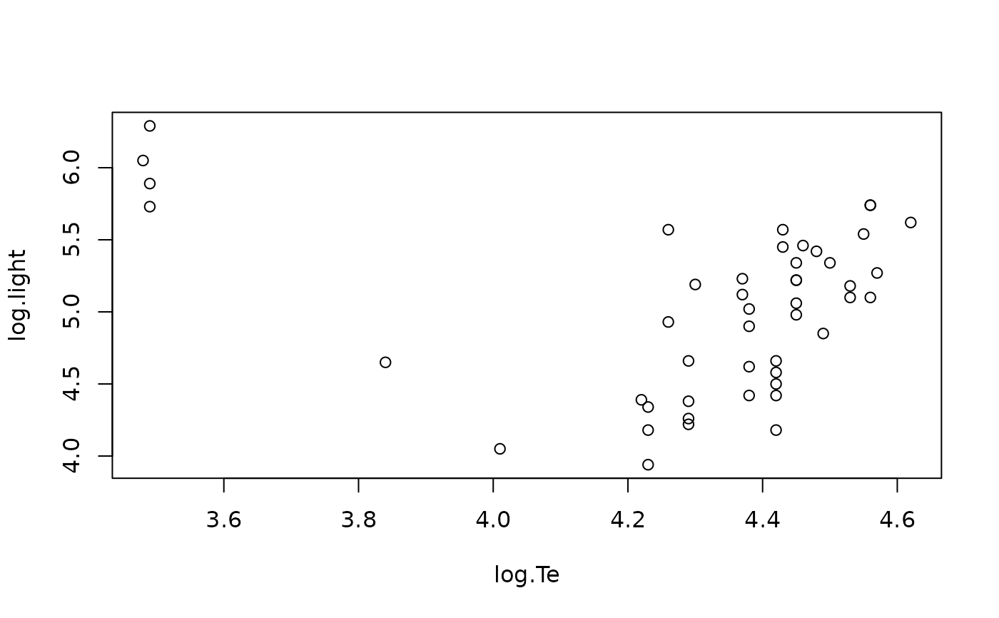 data(starsCYG, package="robustbase")A data frame with 47 observations on the following 2 variables