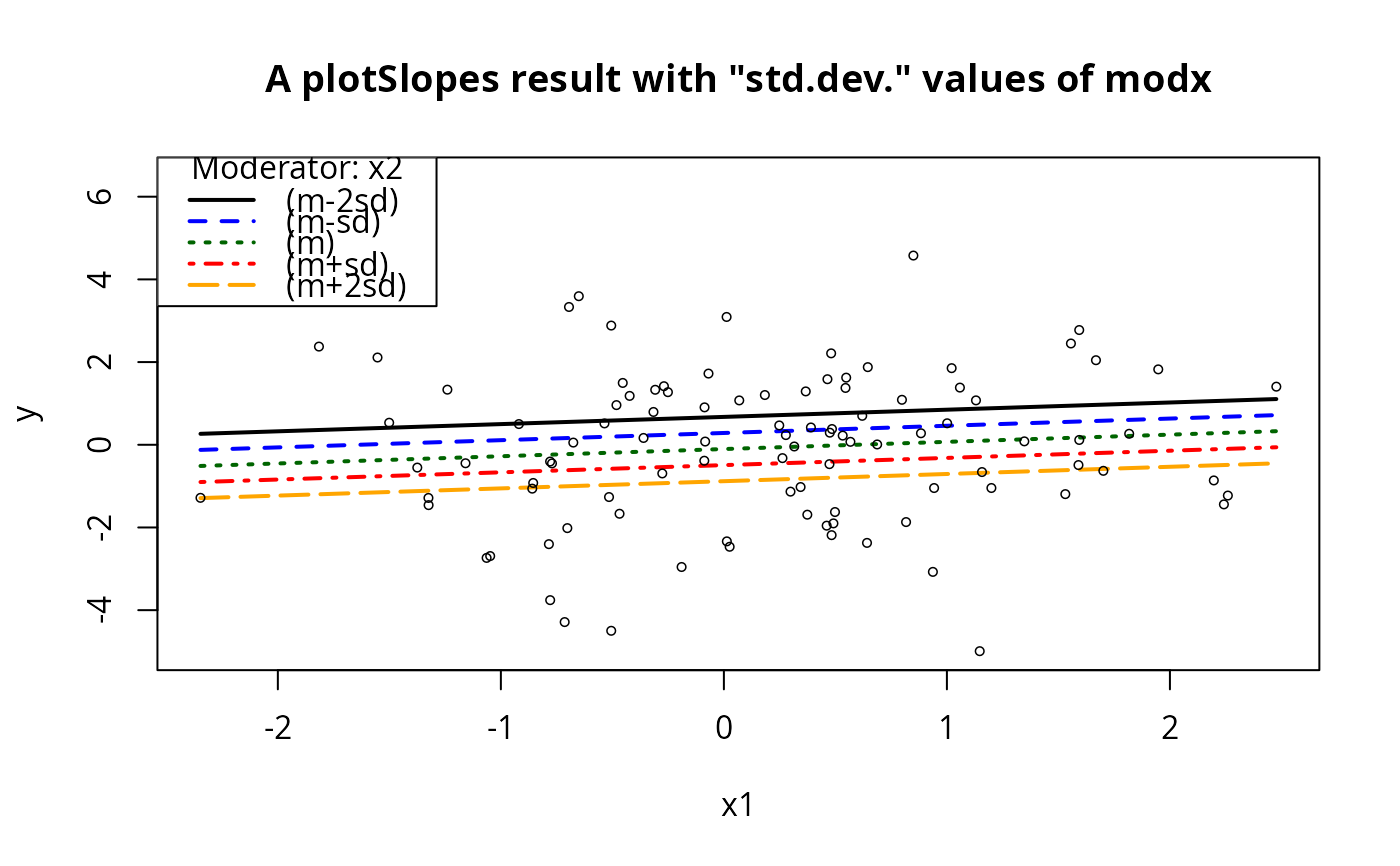 n = 5, main = "A plotSlopes result with \"std.dev.\" values of modx")