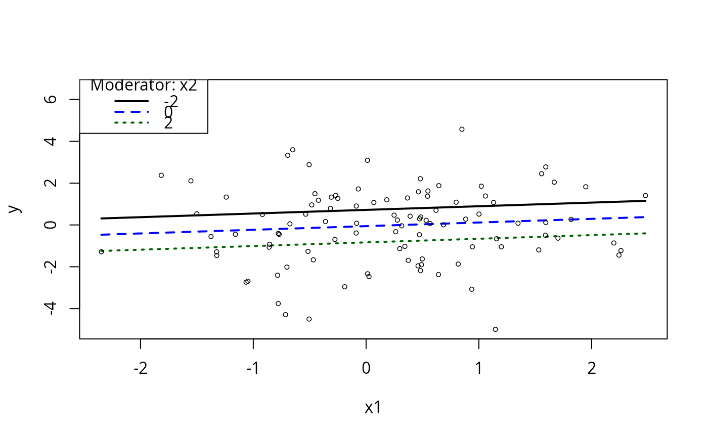 m1ps <- plotSlopes(m1, plotx = "x1", modx = "x2", modxVals = c(-2,0,2))