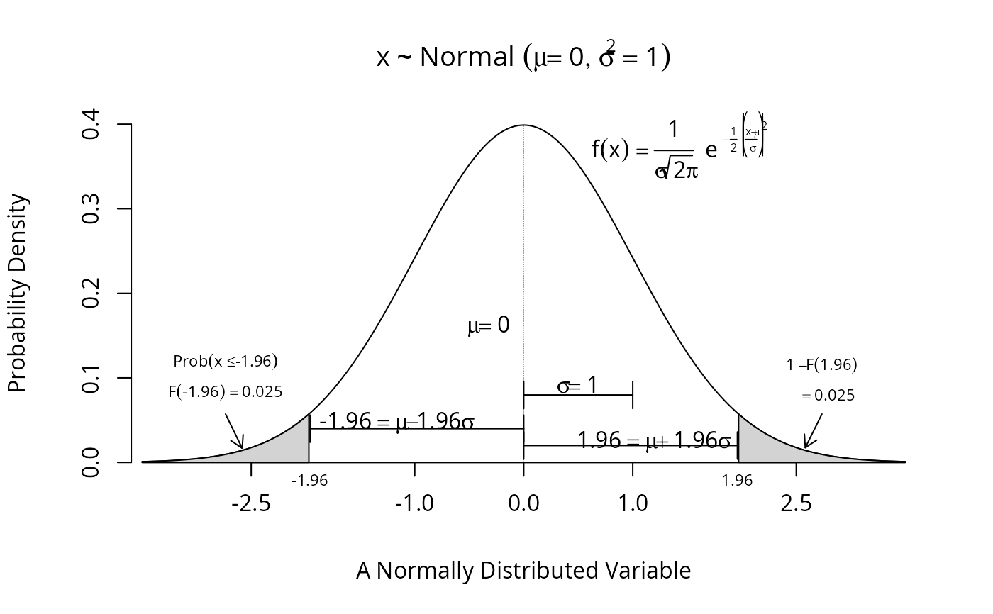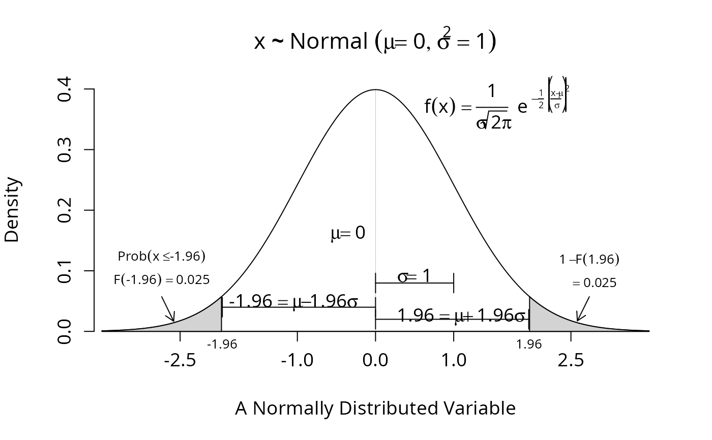 drawnorm(mu = 0, sigma = 1, ylab = "Density", ps = 14)