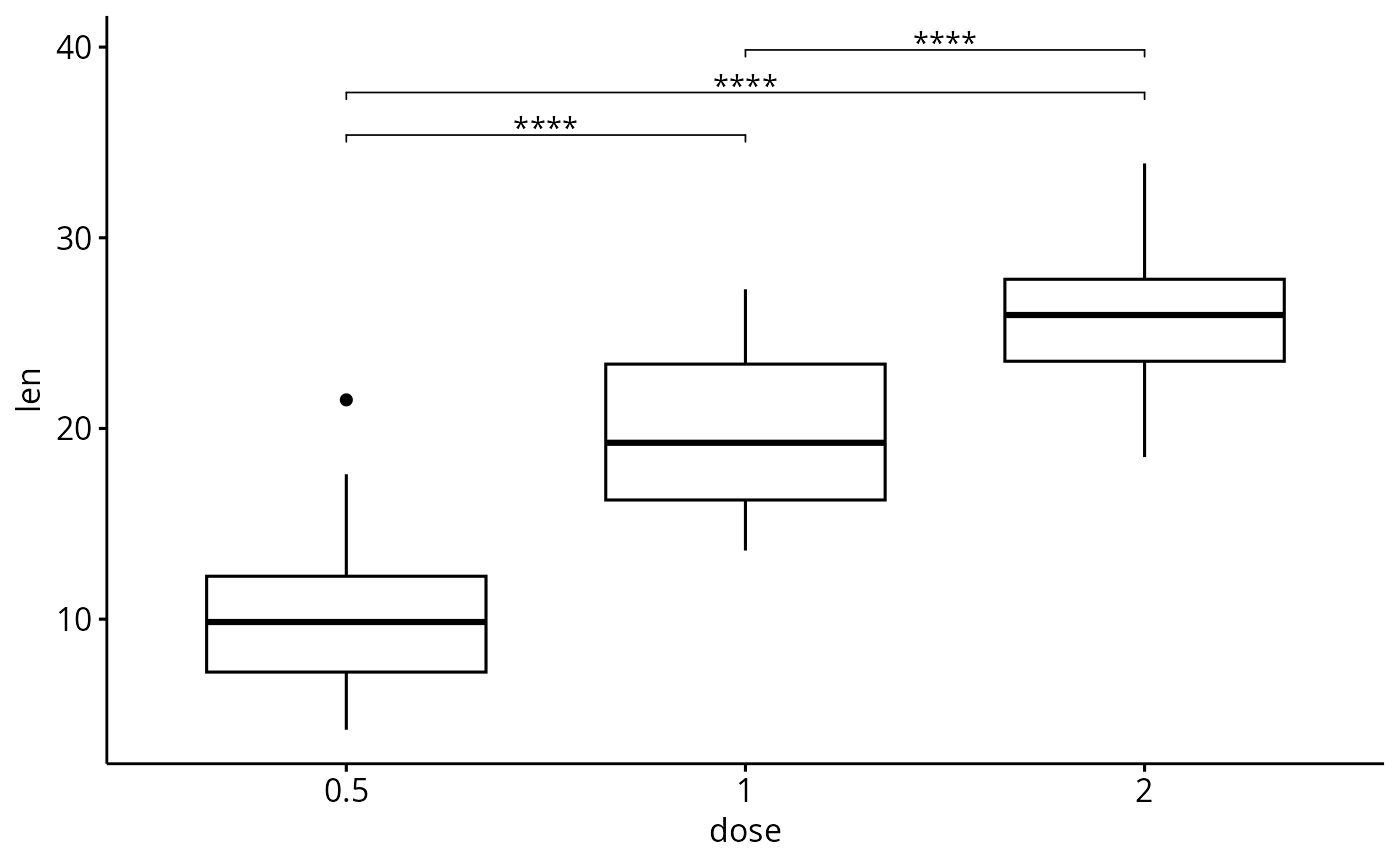 #> 1 len 0.5 1 20 20 -6.48 38.0 1.27e- 7 2.54e- 7 ****