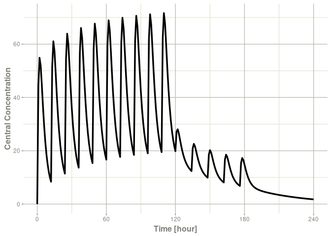 et(0:240) # Add sampling You can see from the above code, you can dose to the compartment named in the rxode2 model. This slight deviation from NONMEM can reduce the need for compartment renumbering.