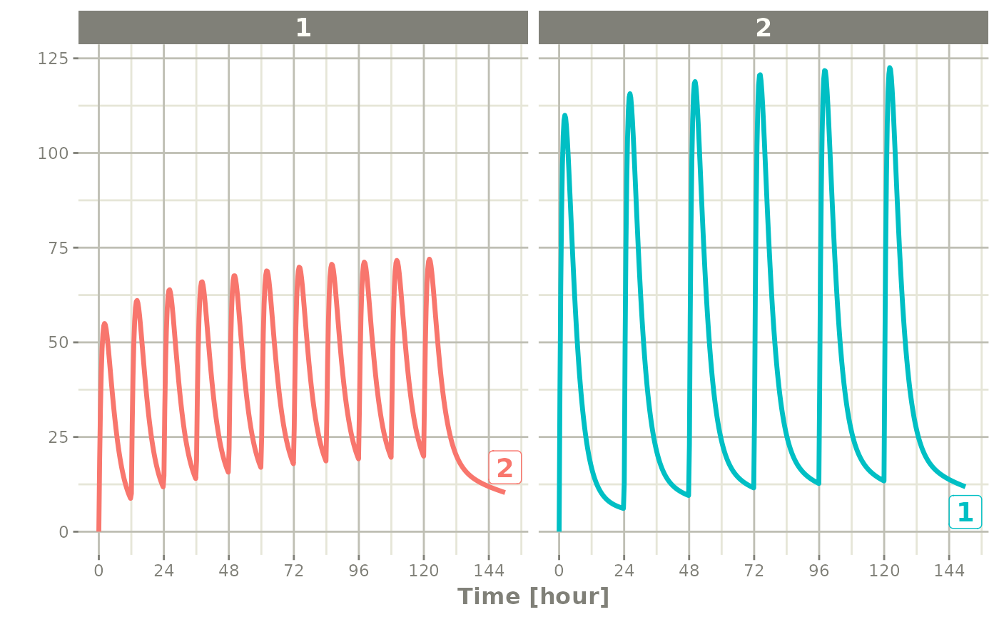 rxSolve(m1, et) %>% plot(C2)#> i parameter labels from comments are typically ignored in non-interactive mode