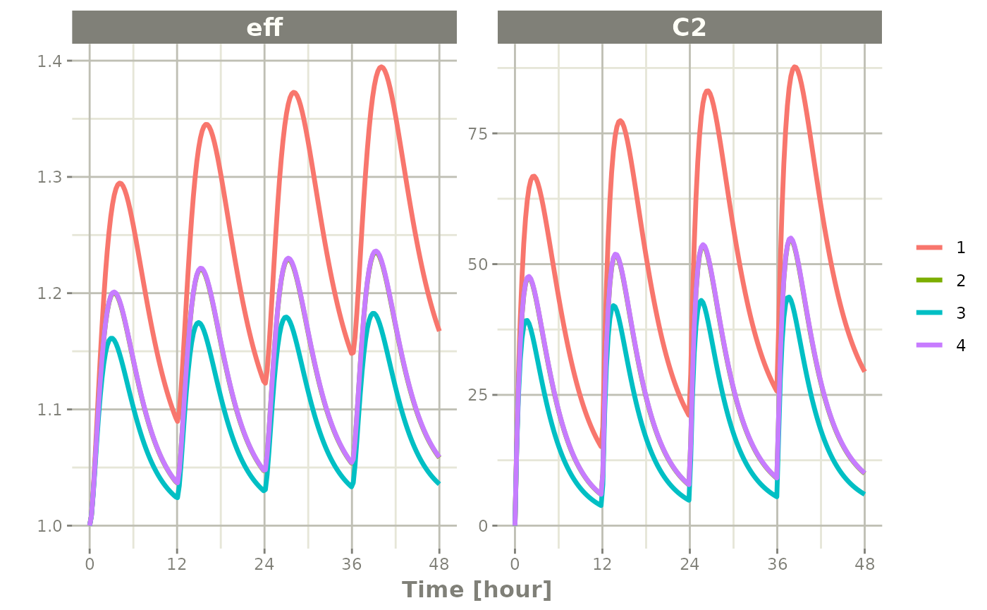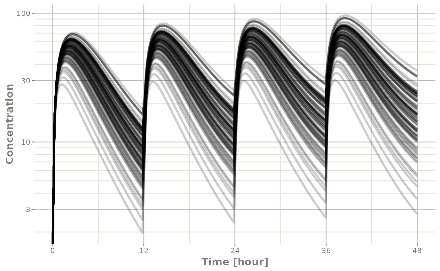 If you have multi-subject plots you can easily plot applying the same principles as above. To illustrate this plot, lets expand an event table to include a plot of 4 subjects with lognormal random variability between subjects;