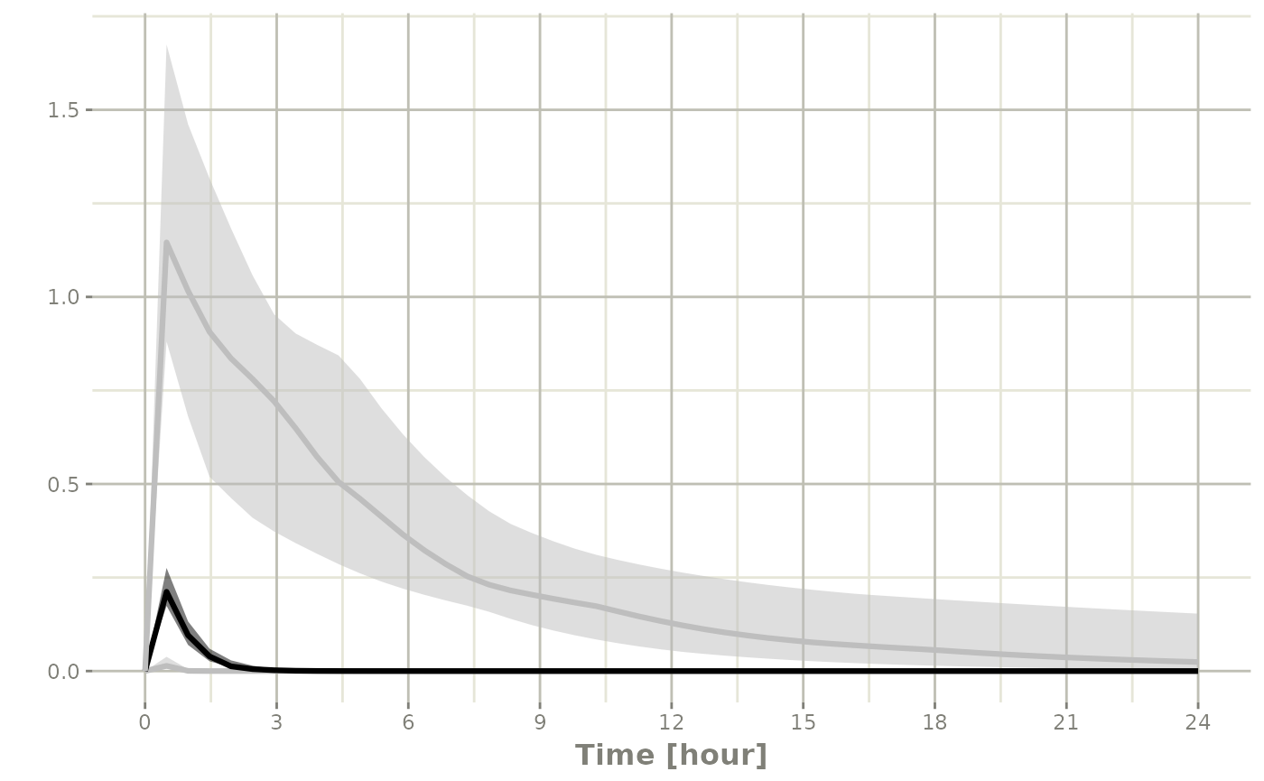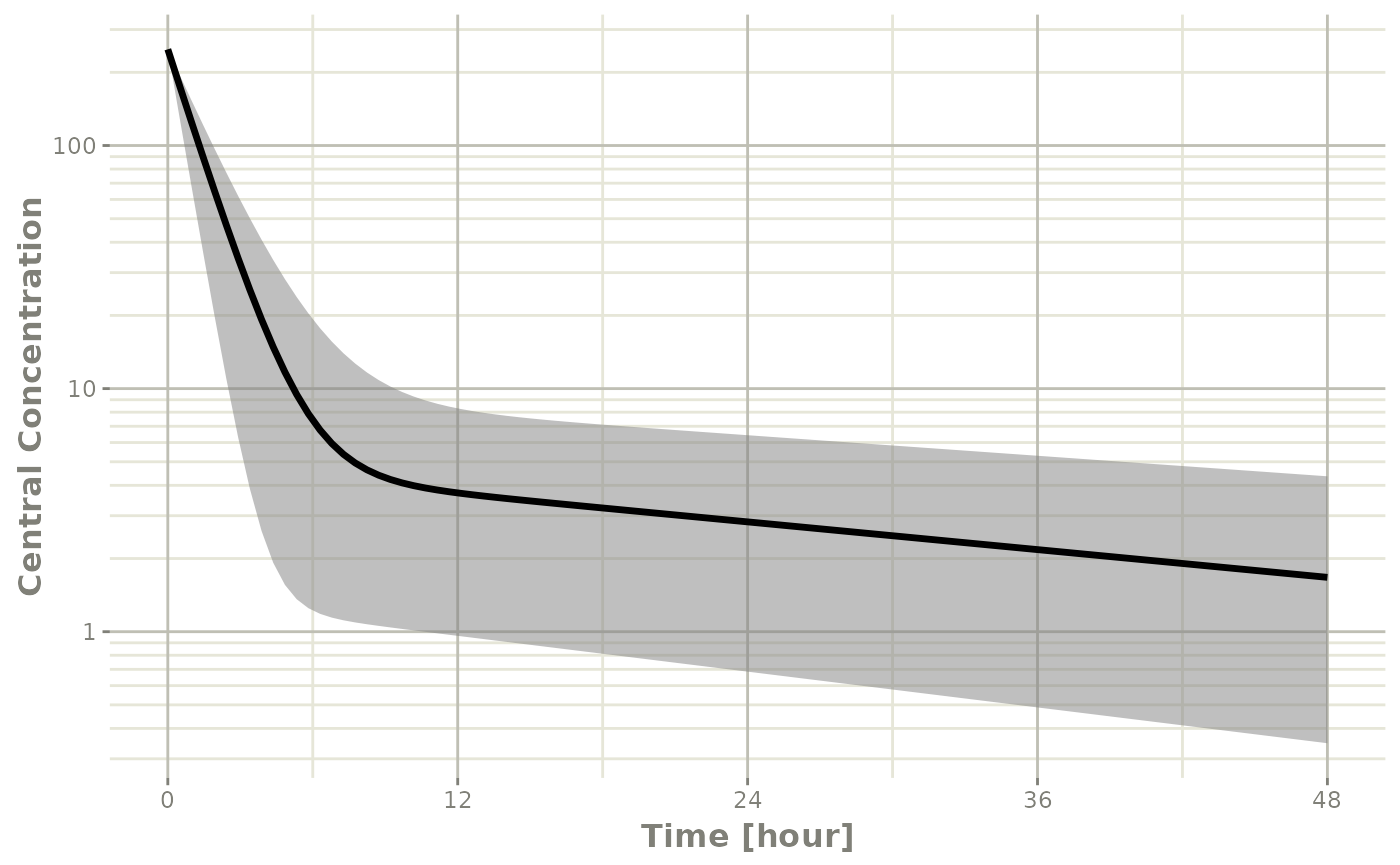Usually in pharmacometric simulations it is not enough to simply simulate the system. We have to do something easier to digest, like look at the central and extreme tendencies of the simulation.