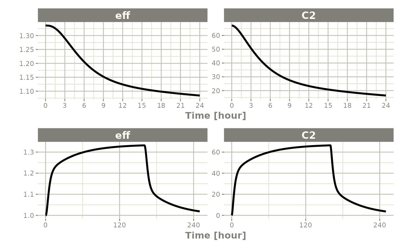 p2 <- rxSolve(m1, ev) %>% plot(C2, eff)#> i parameter labels from comments are typically ignored in non-interactive mode