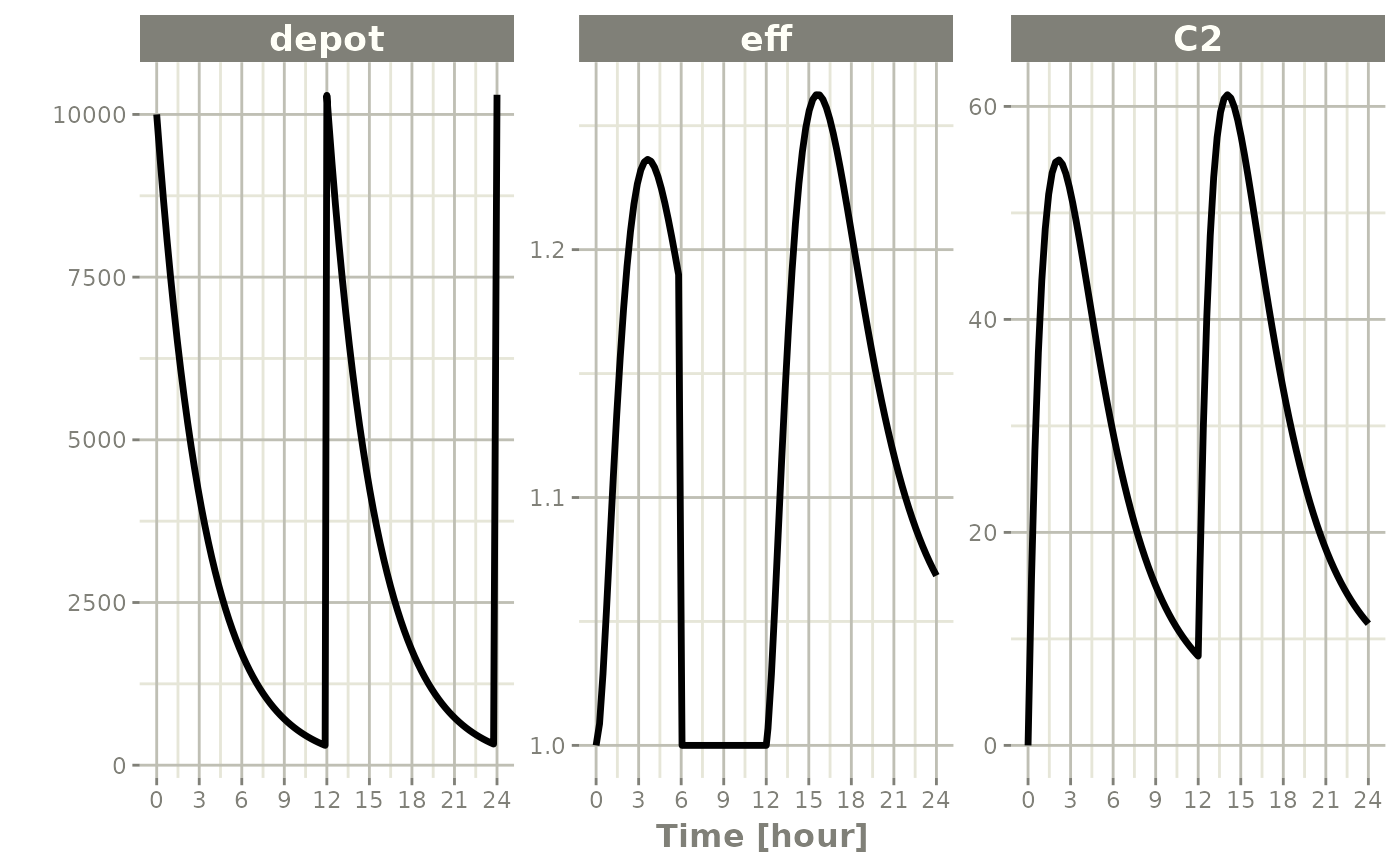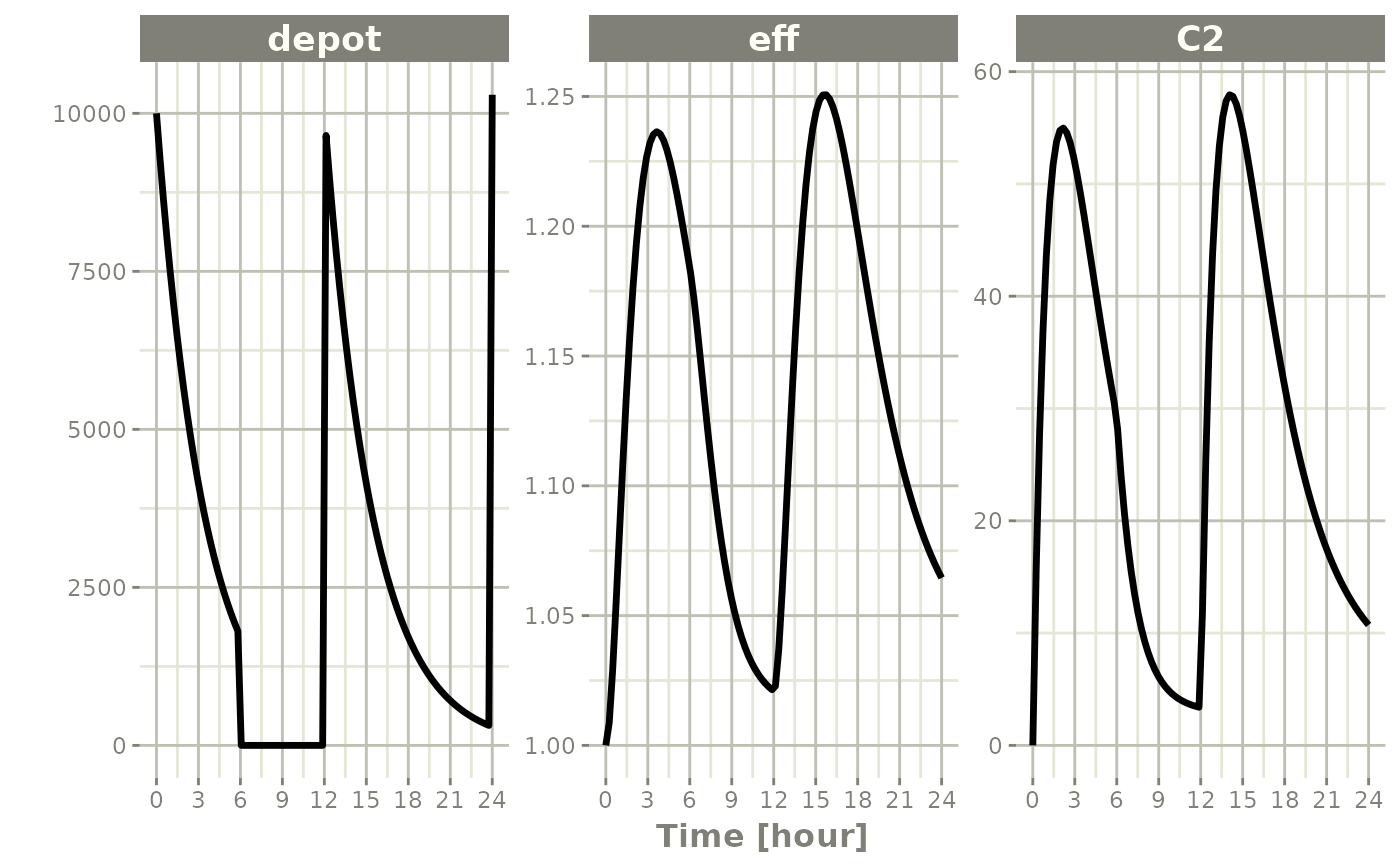 rxSolve(m1, ev) %>% plot(depot,C2, eff)#> i parameter labels from comments are typically ignored in non-interactive mode