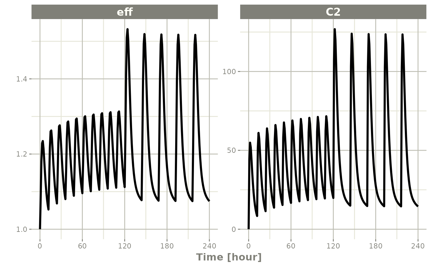 x2 <- rxSolve(mod1, et %>% et(id=1:2), params=data.frame(CL=c(18.6, 7.6)))