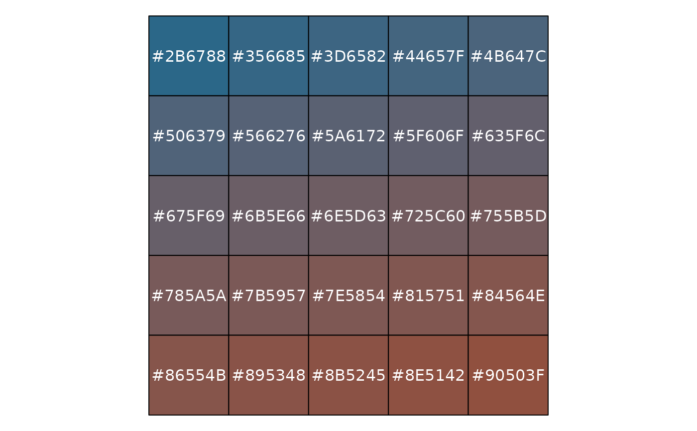 seq_gradient_pal(low = "#2B6788", high = "#90503F", space = "Lab")
