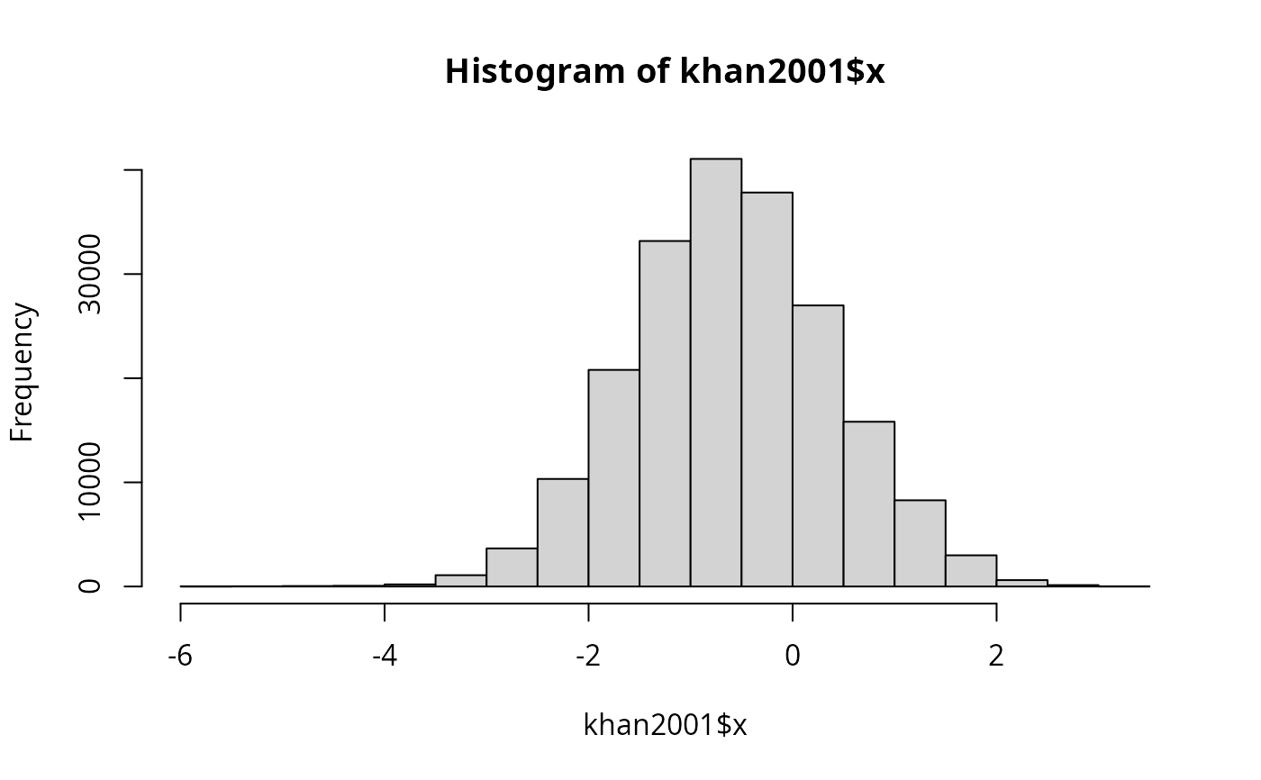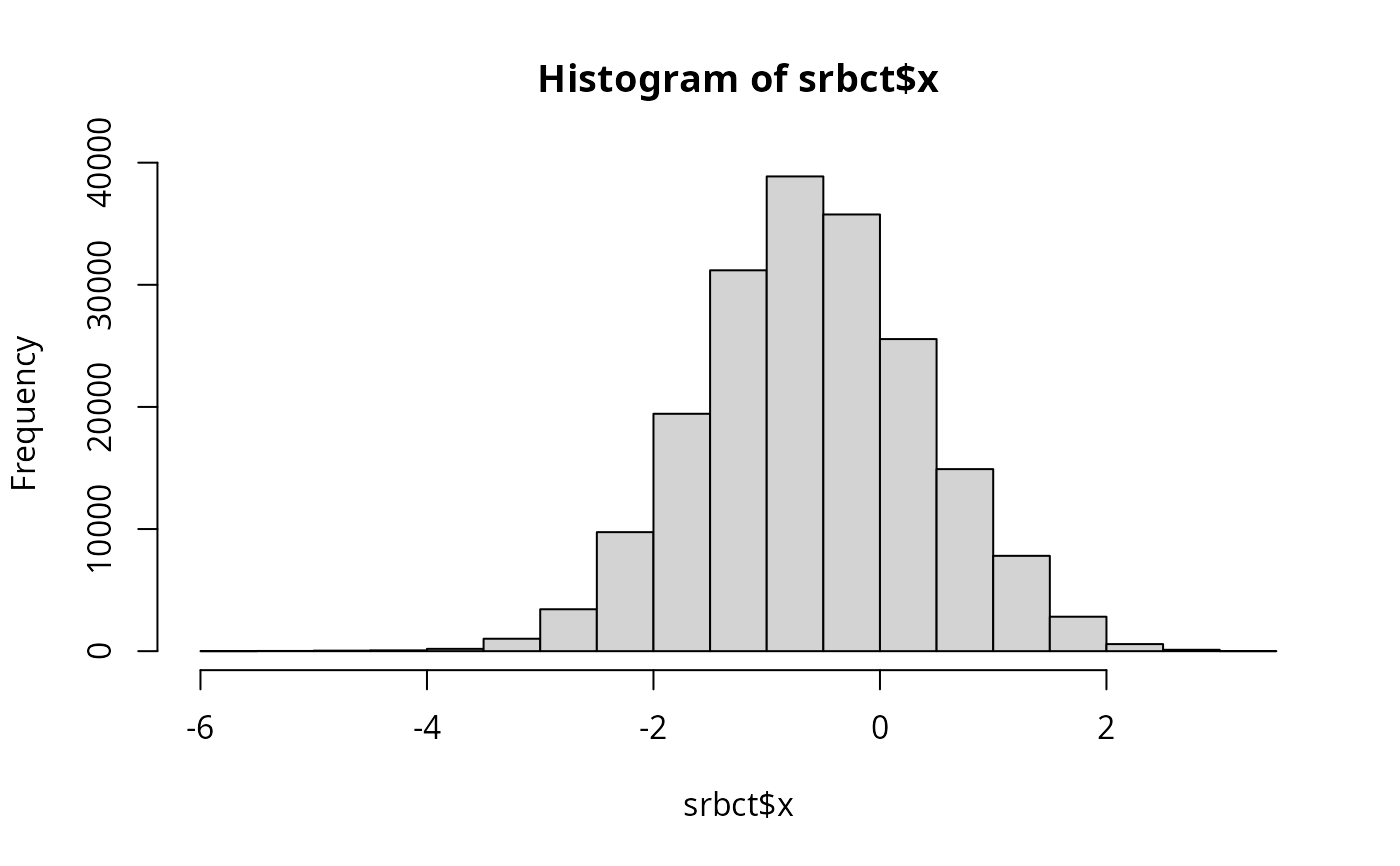 data(khan2001)This data set contains measurements of the gene expression of 2308 genes for 88 observations: 29 cases of Ewing sarcoma (EWS), 11 cases of Burkitt lymphoma (BL), 18 cases of neuroblastoma (NB), 25 cases of rhabdomyosarcoma (RMS), and 5 other (non-SRBCT) samples.