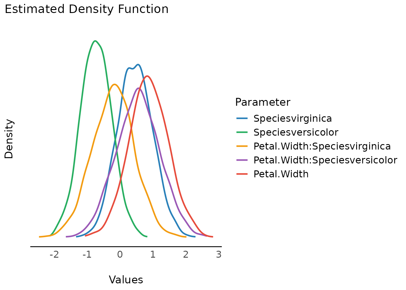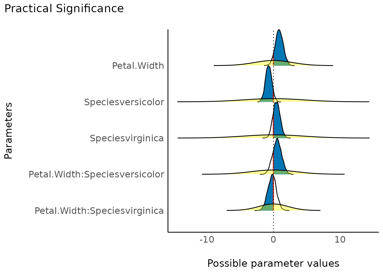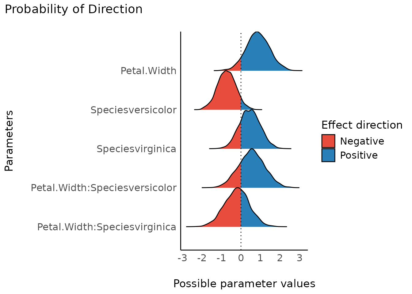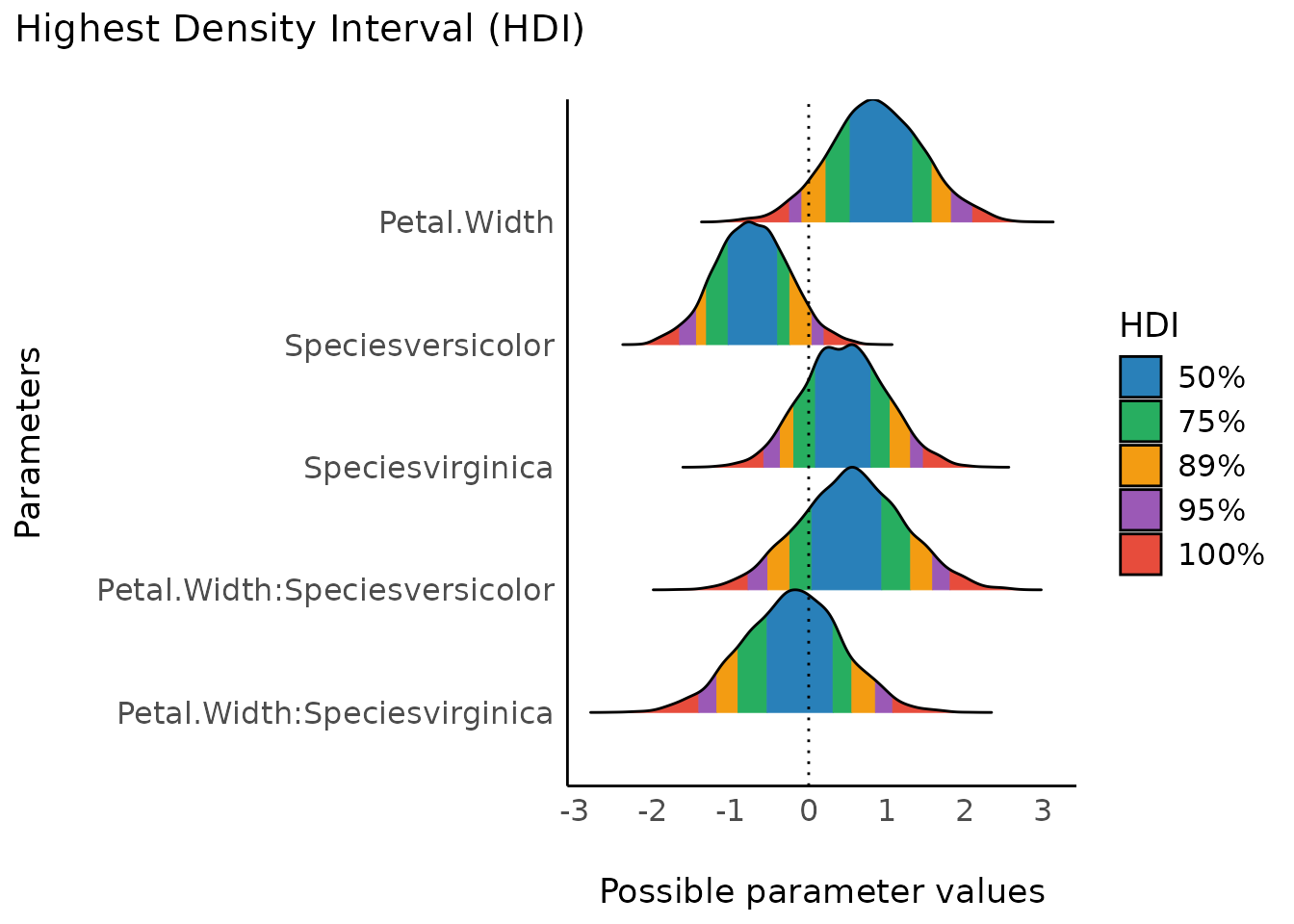 #> Petal.Width:Speciesvirginica | Undecided | 10.74 % | [-1.49, 1.01]
