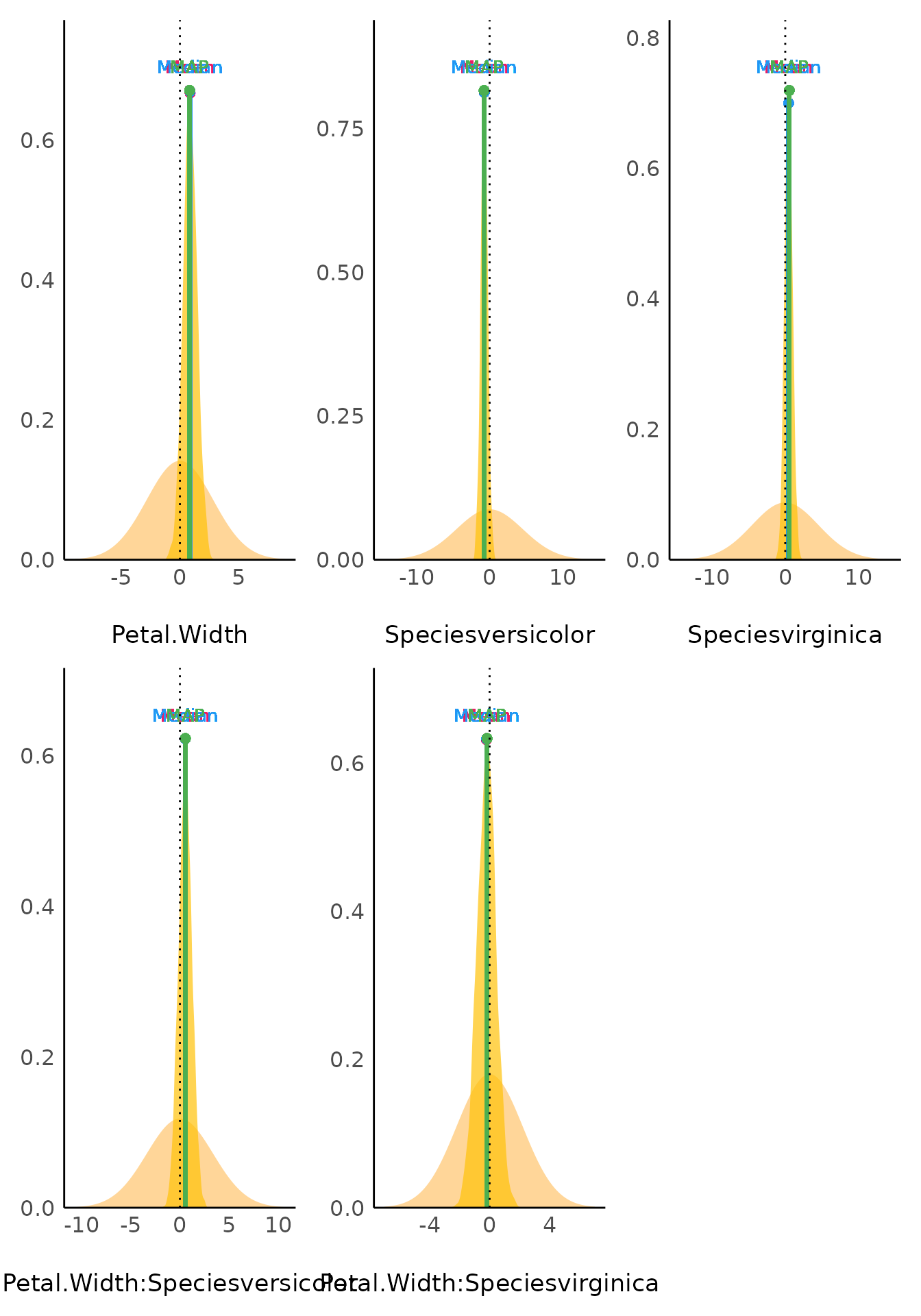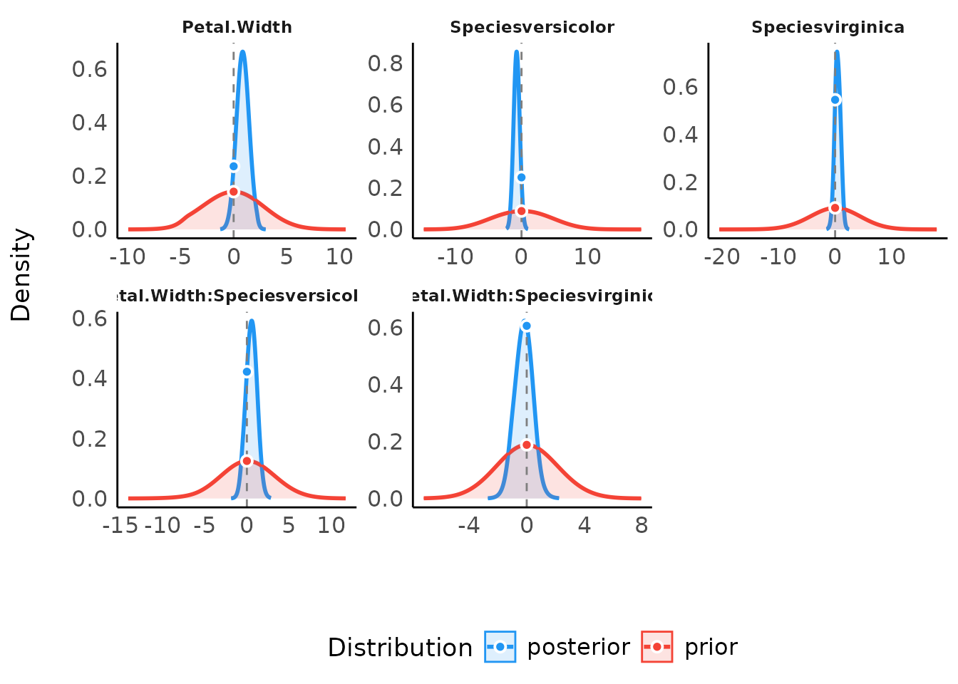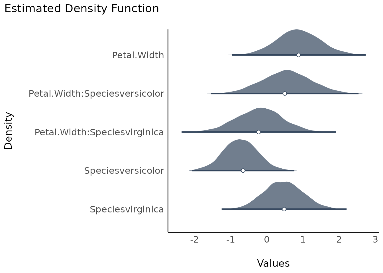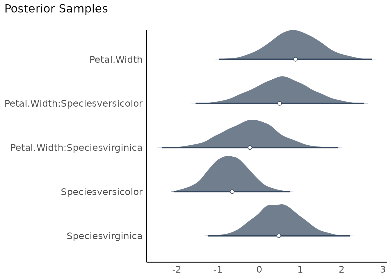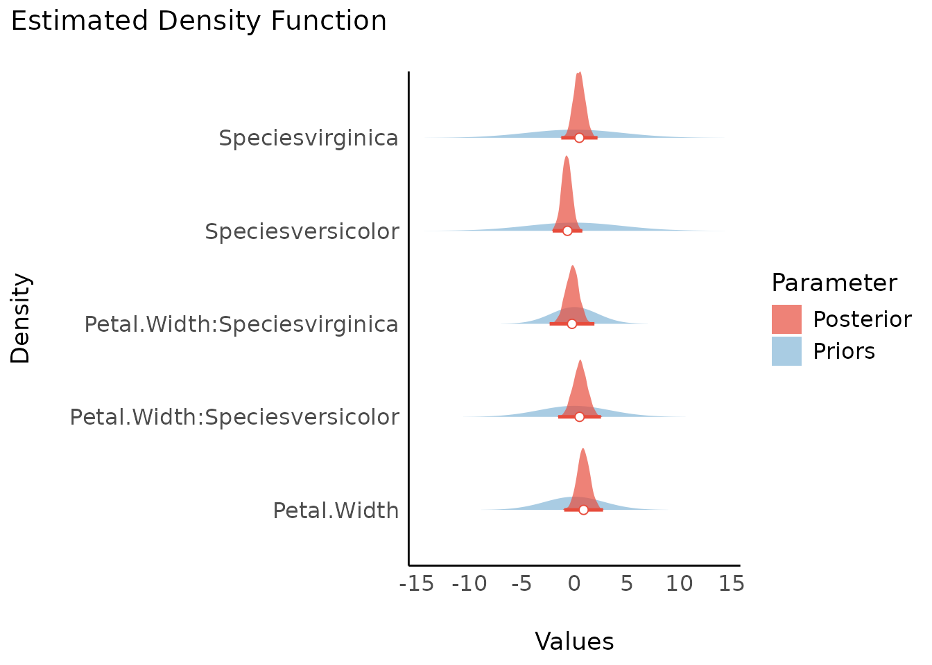 #> Petal.Width:Speciesvirginica | Undecided | 10.74 % | [-1.49, 1.01]