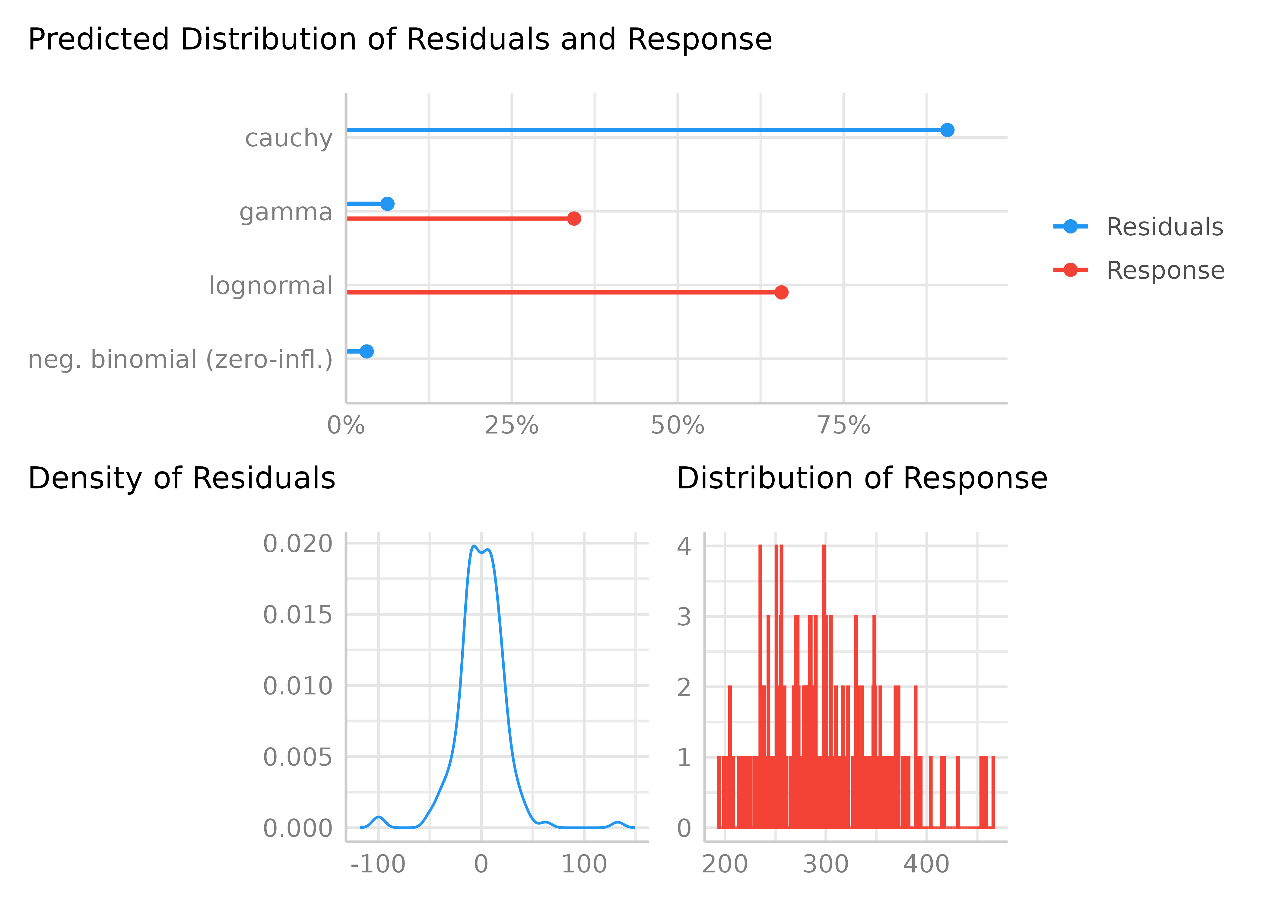 The composition of plots when checking model assumptions depends on the type of the input model. E.g., for logistic regression models, a binned residuals plot is used, while for linear models a plot of homegeneity of variance is shown instead. Models from count data include plots to inspect overdispersion.