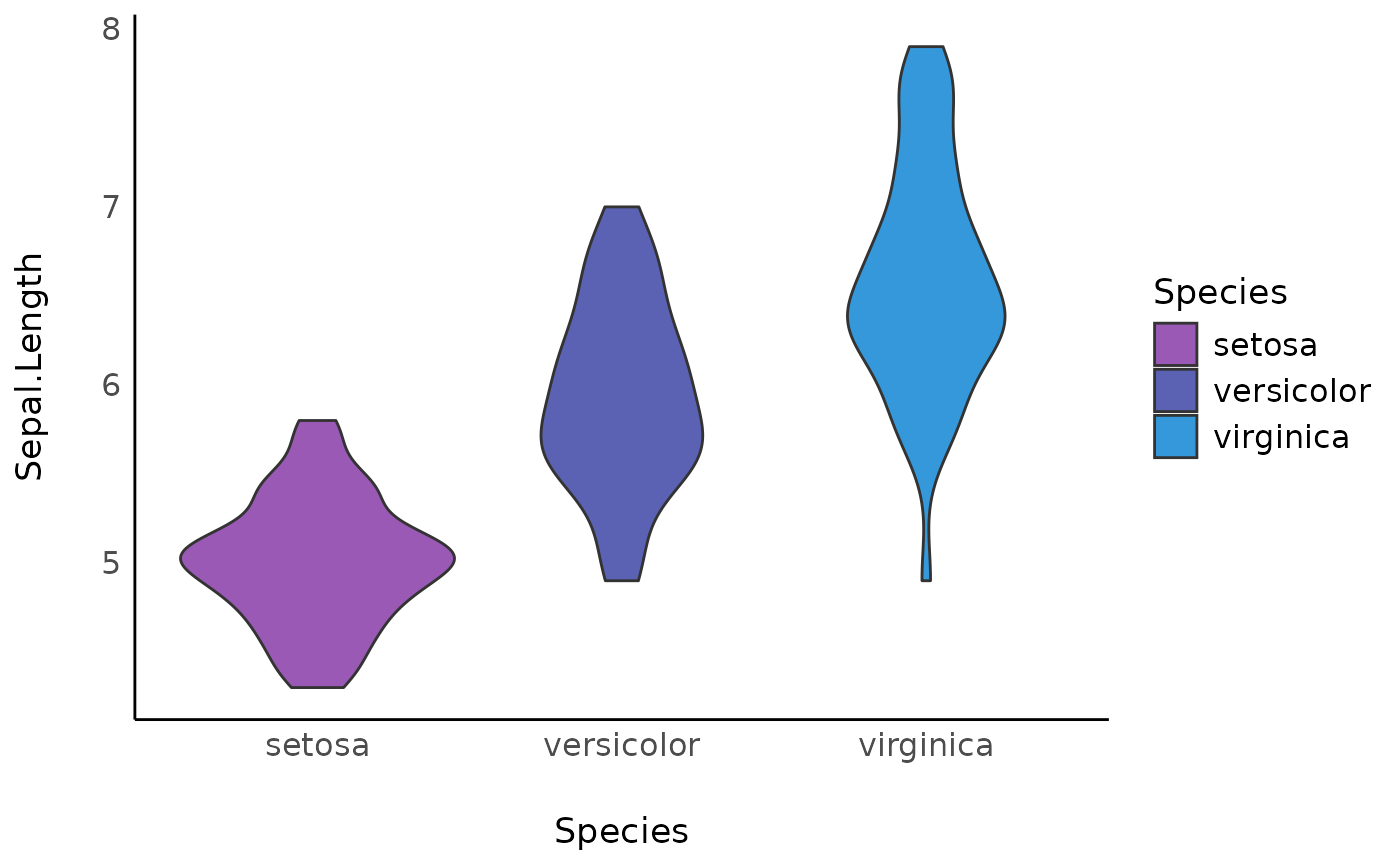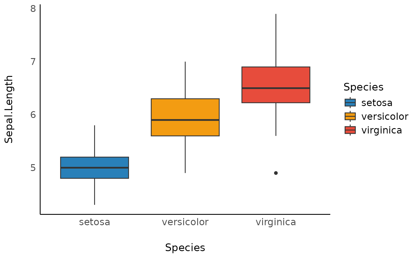 ggplot(iris, aes(x = Species, y = Sepal.Length, fill = Species)) +