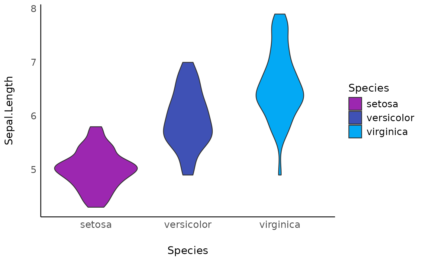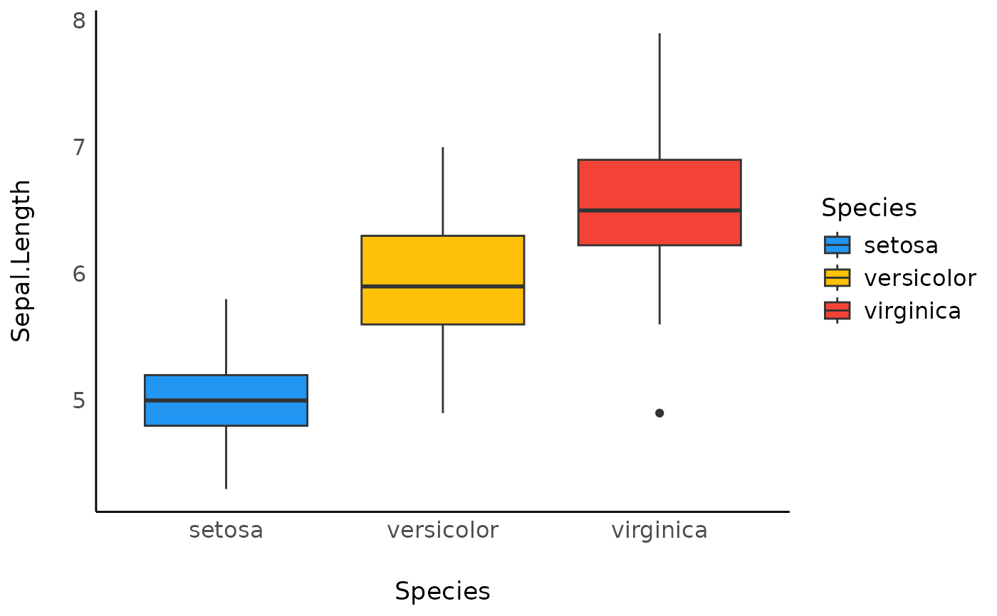 ggplot(iris, aes(x = Species, y = Sepal.Length, fill = Species)) +