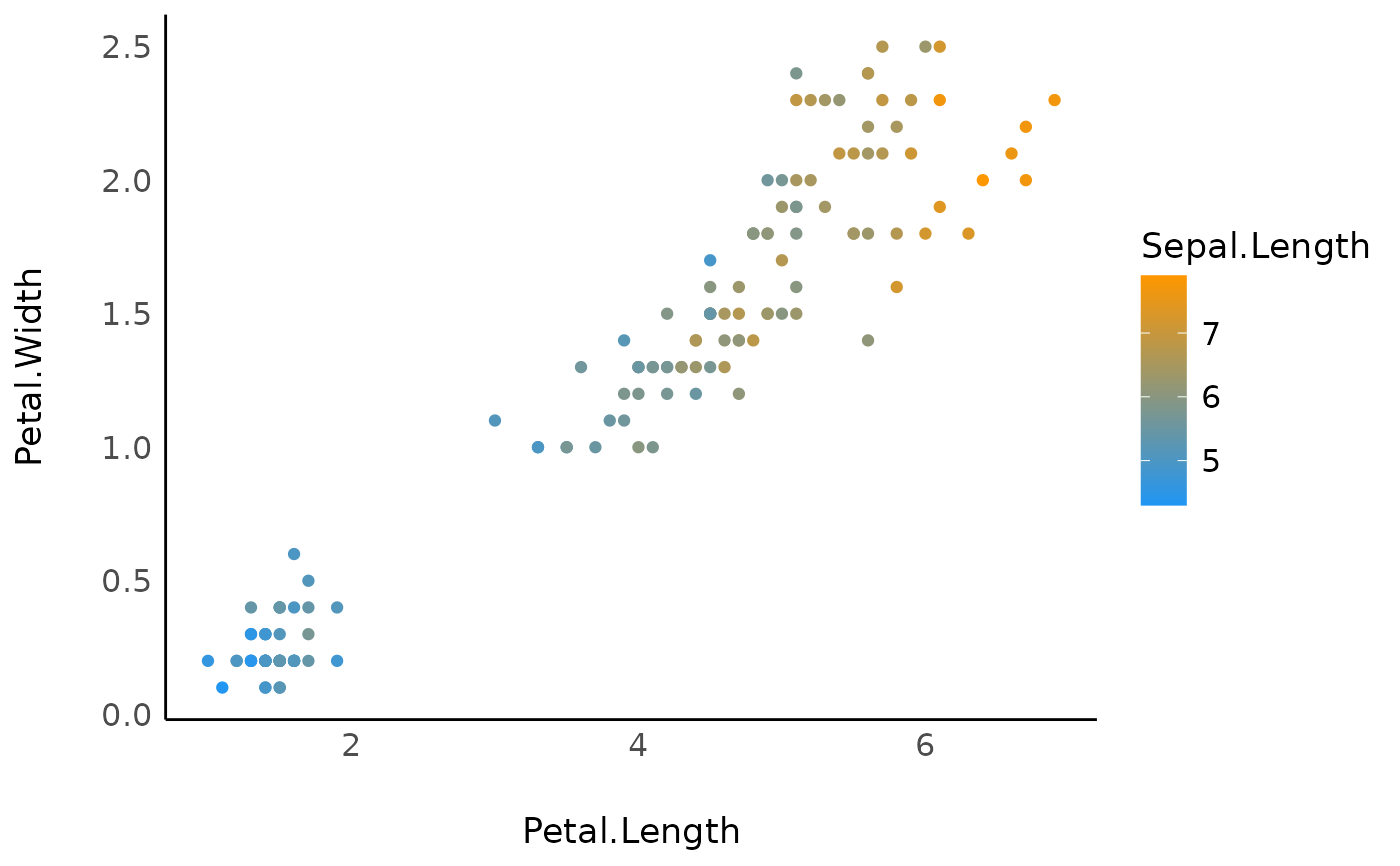 ggplot(iris, aes(x = Petal.Length, y = Petal.Width, color = Sepal.Length)) +