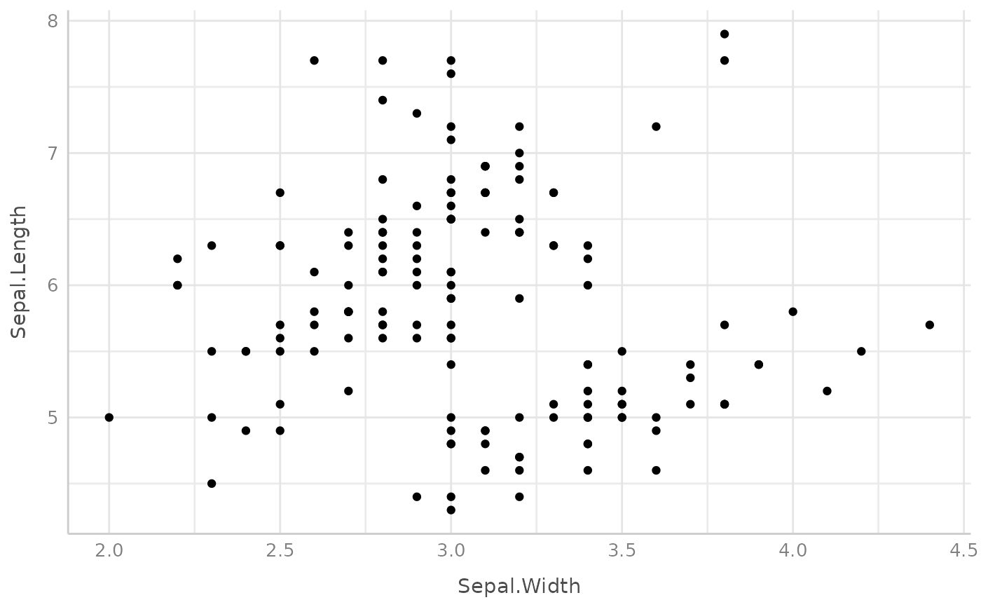 ggplot(iris, aes(x = Sepal.Width, y = Sepal.Length)) +