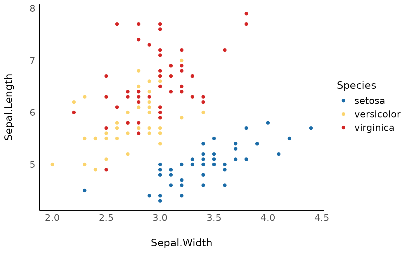 ggplot(iris, aes(x = Sepal.Width, y = Sepal.Length, color = Species)) +