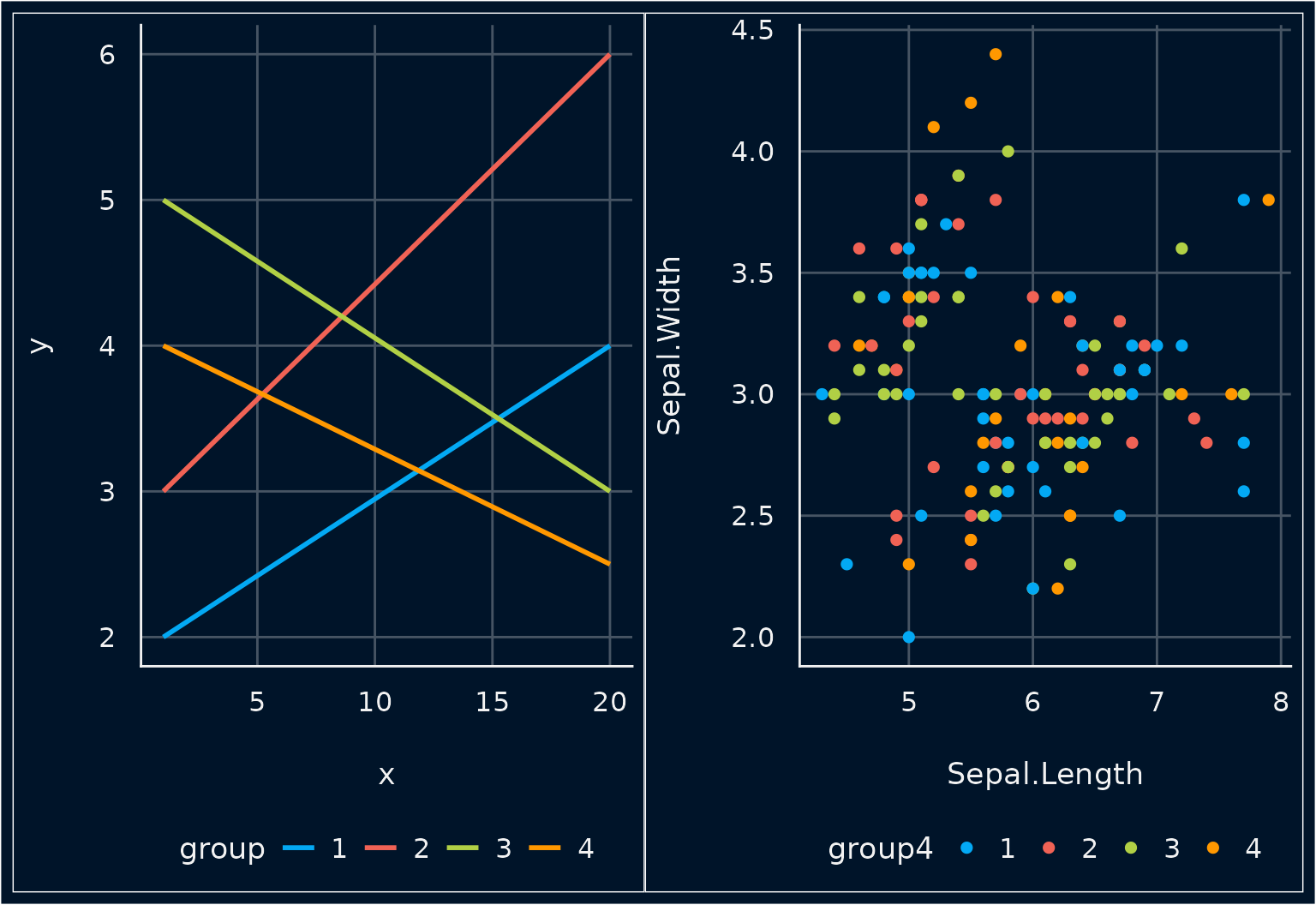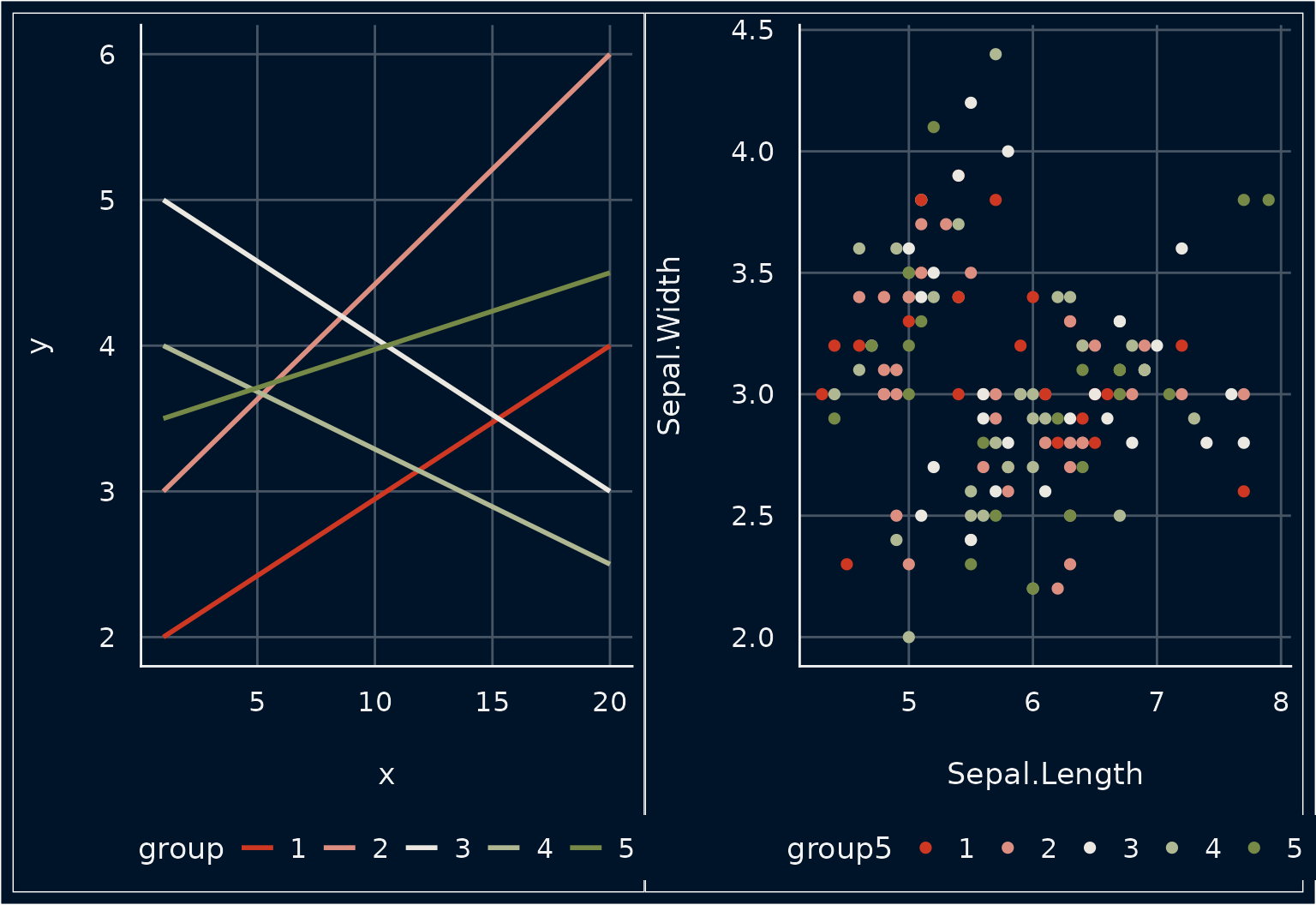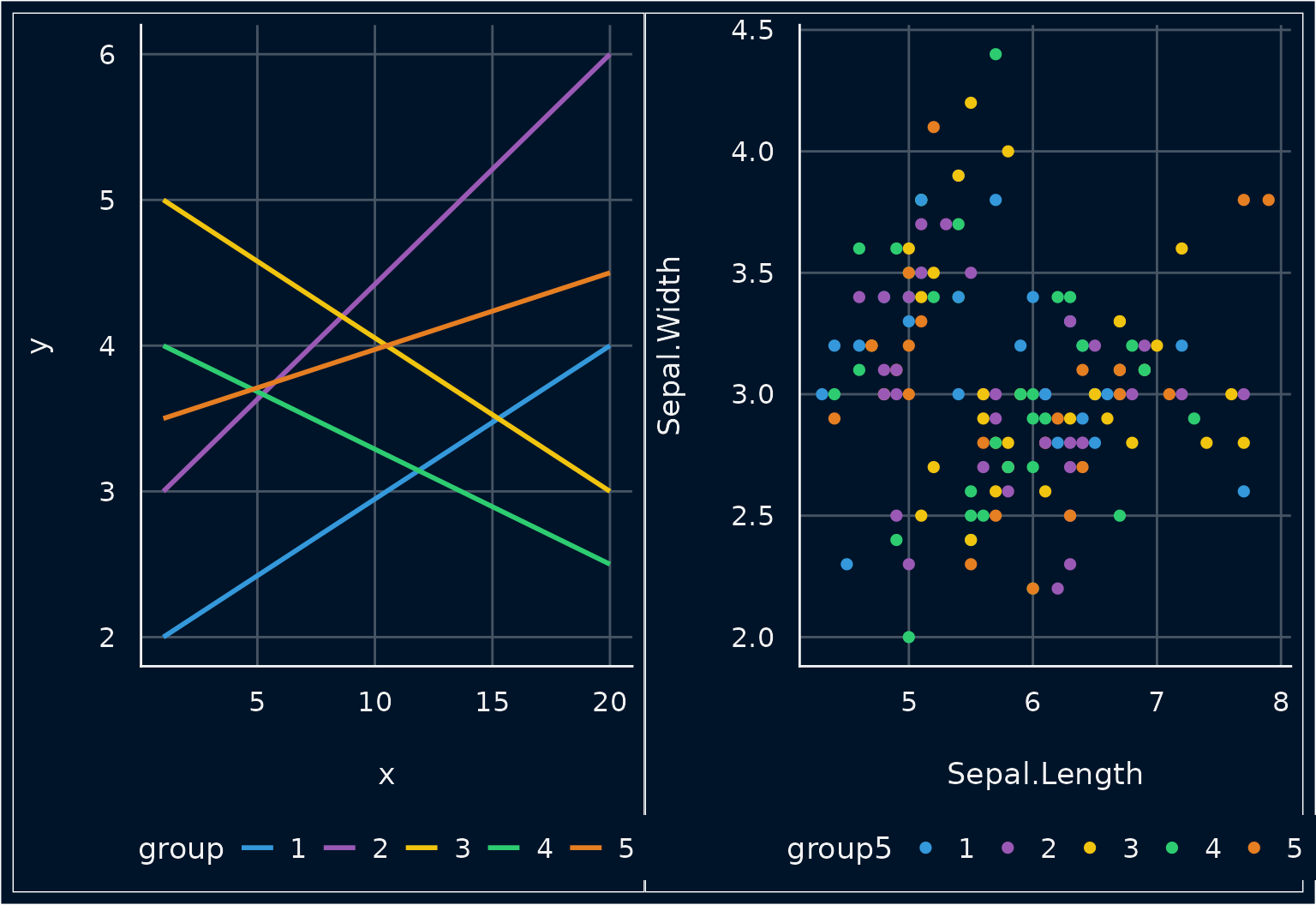 #> }Before we start, we create some data sets with three, four and five groups; one is useful to demonstrate line-geoms, the iris-dataset is used for point-geoms.