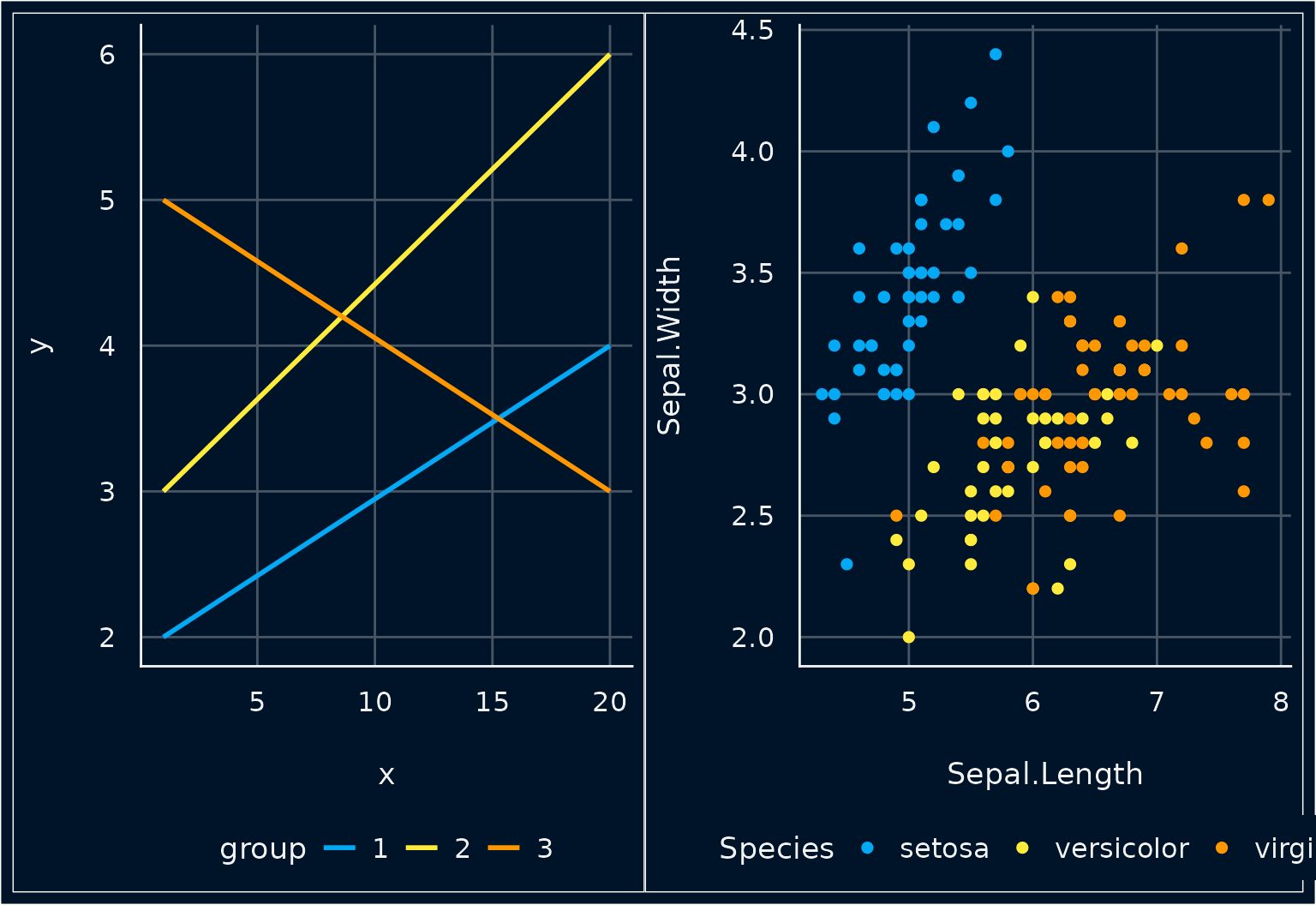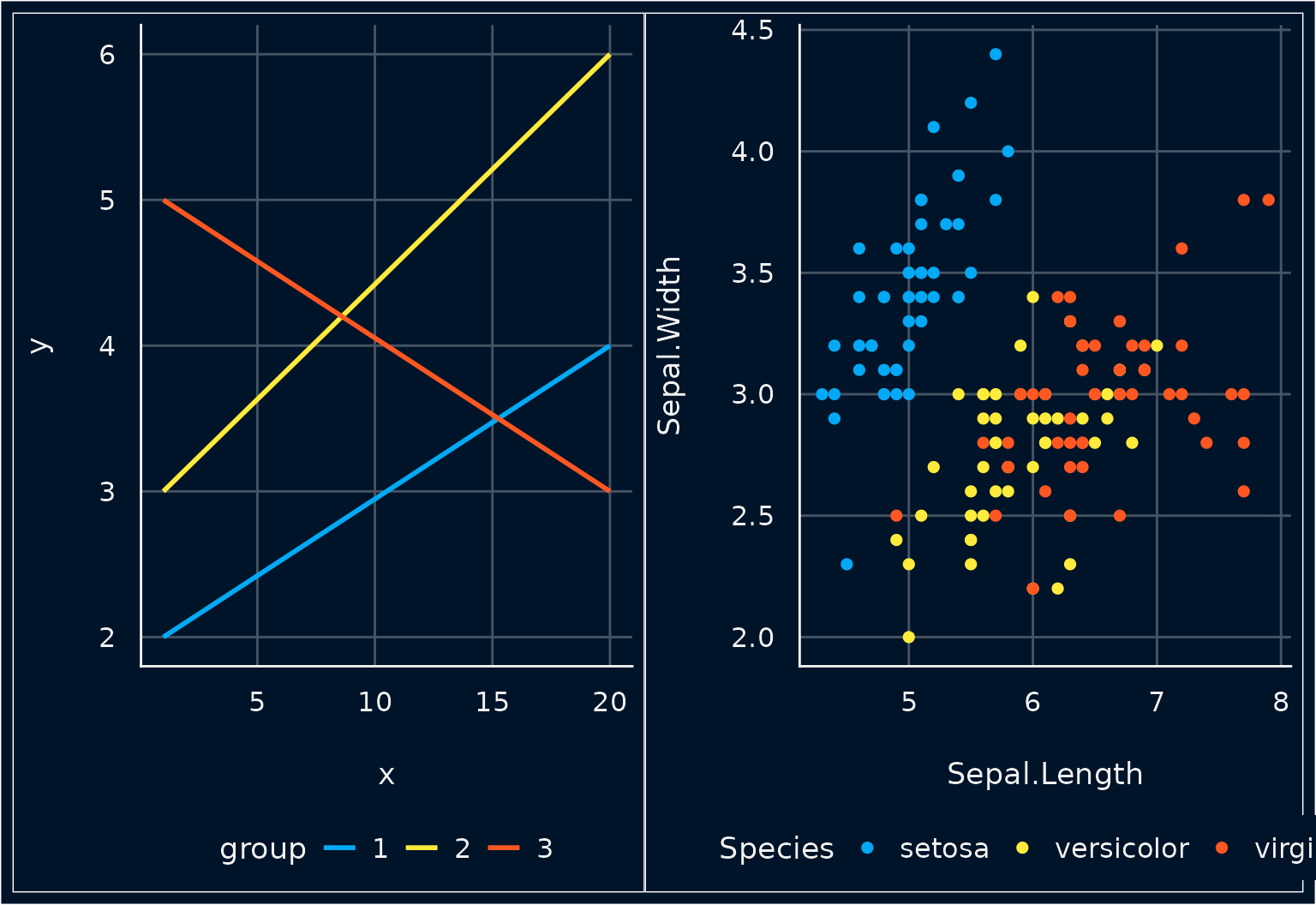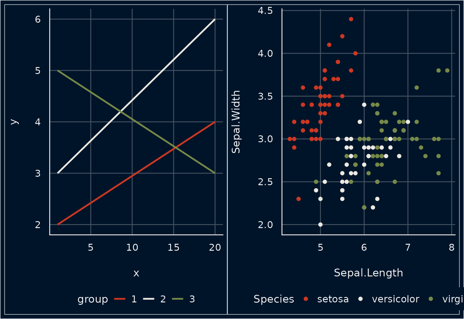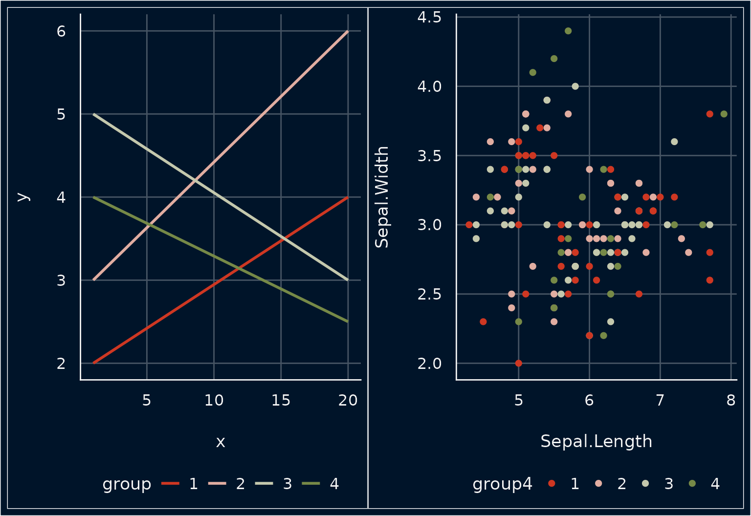 #> }Before we start, we create some data sets with three, four and five groups; one is useful to demonstrate line-geoms, the iris-dataset is used for point-geoms.