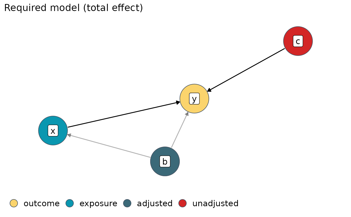 #> To estimate the direct and total effect, at least adjust for `b`. Currently, the model does not adjust for any variables.