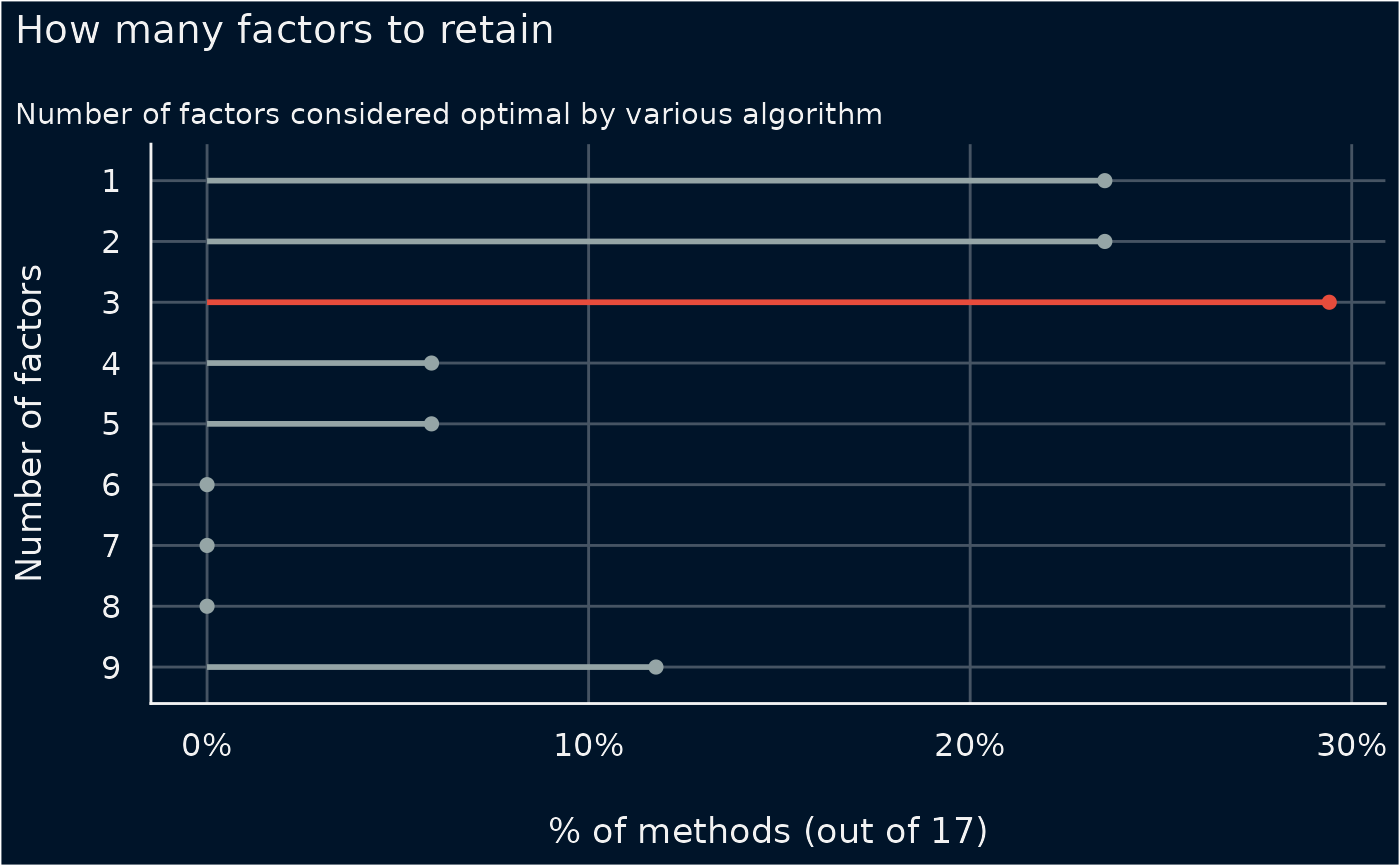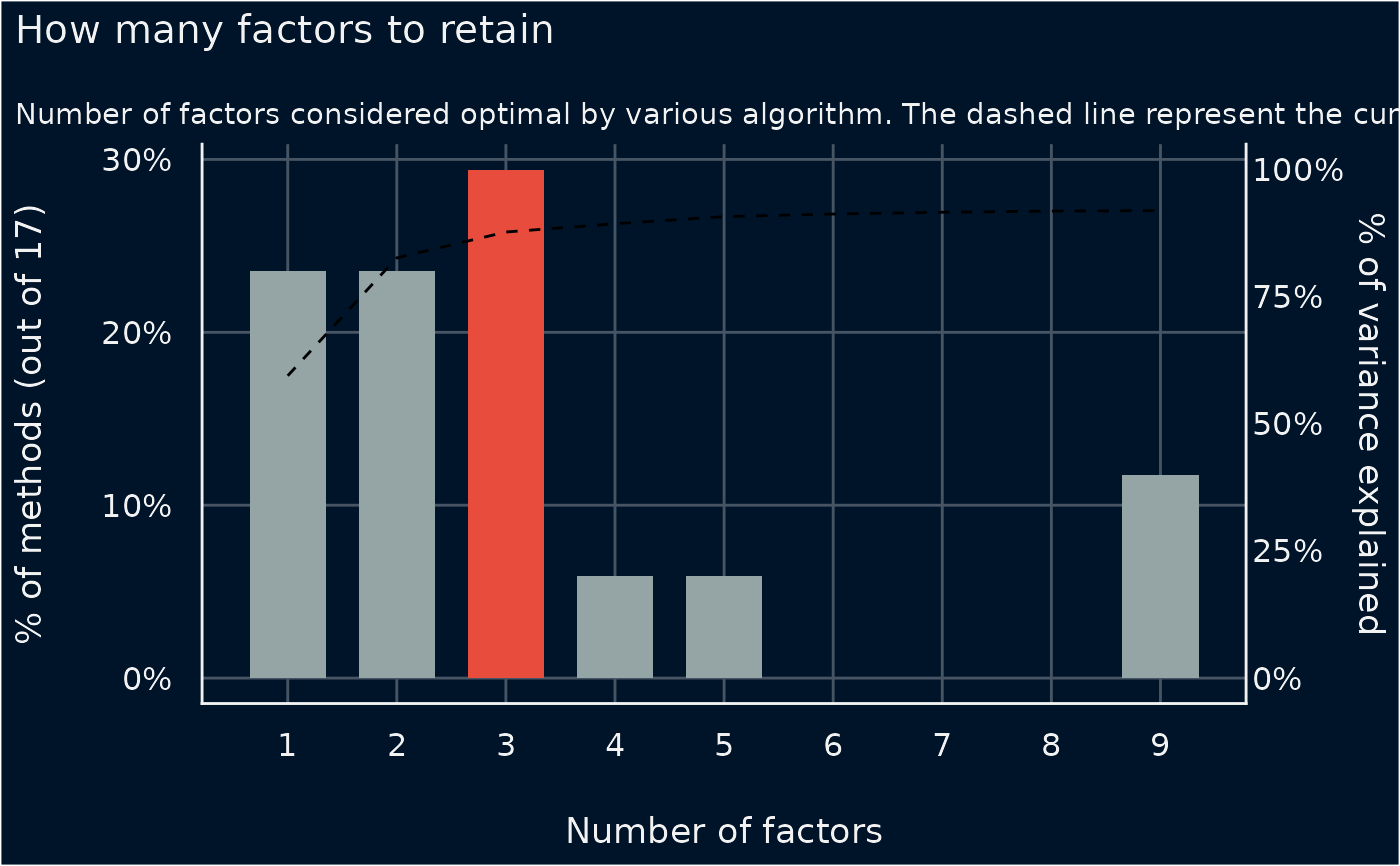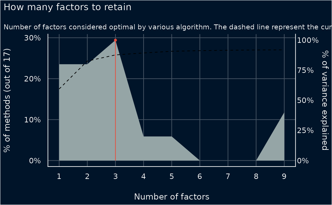 #> The choice of 3 dimensions is supported by 5 (29.41%) methods out of 17 (Bartlett, CNG, Scree (SE), Scree (R2), Velicer's MAP).