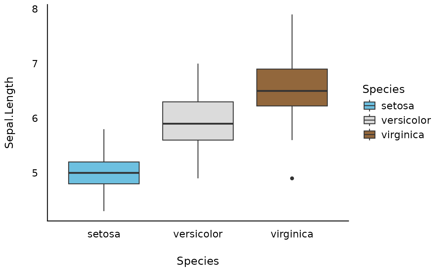 ggplot(iris, aes(x = Species, y = Sepal.Length, fill = Species)) +