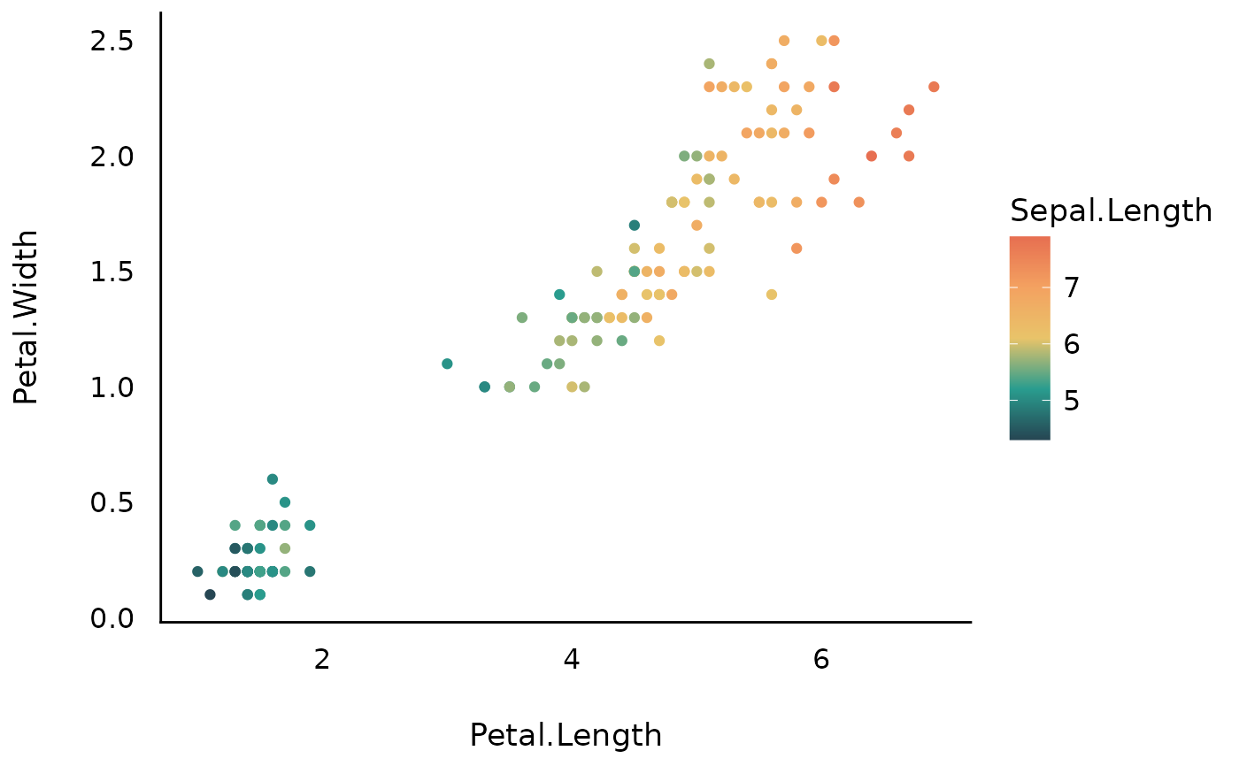 ggplot(iris, aes(x = Petal.Length, y = Petal.Width, color = Sepal.Length)) +