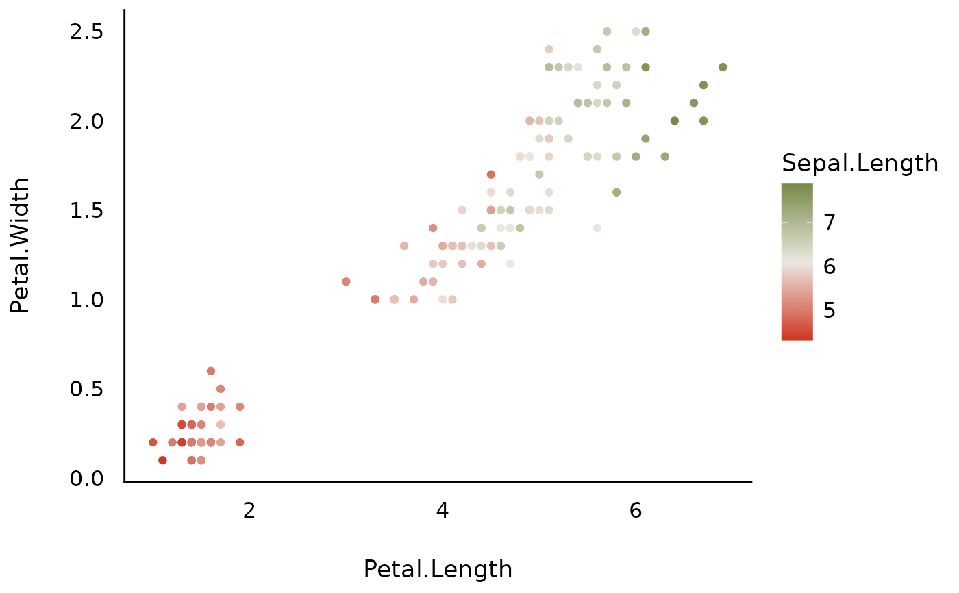 ggplot(iris, aes(x = Petal.Length, y = Petal.Width, color = Sepal.Length)) +