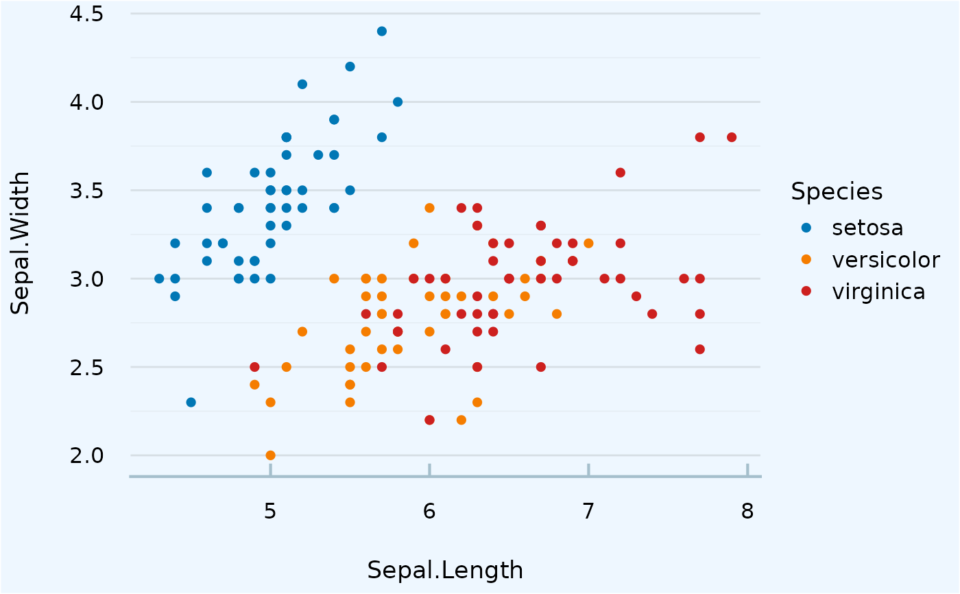 ggplot(iris, aes(Sepal.Length, Sepal.Width, colour = Species)) +