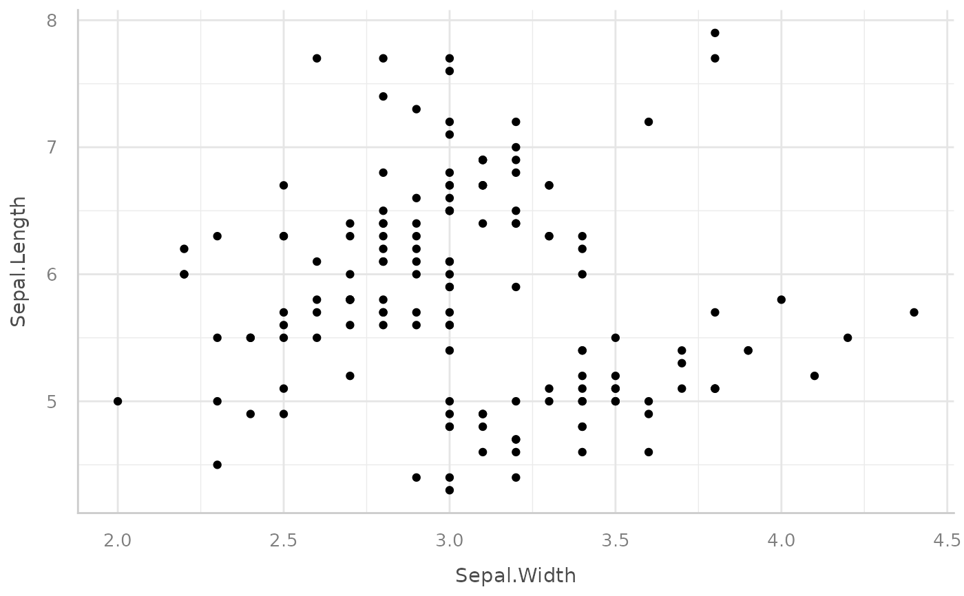 ggplot(iris, aes(x = Sepal.Width, y = Sepal.Length)) +
