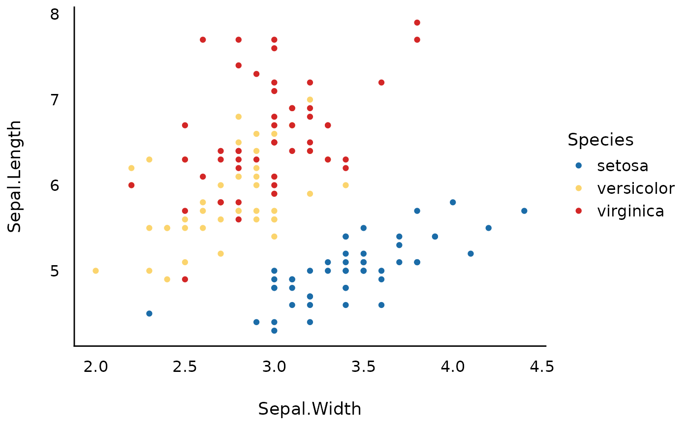 ggplot(iris, aes(x = Sepal.Width, y = Sepal.Length, color = Species)) +