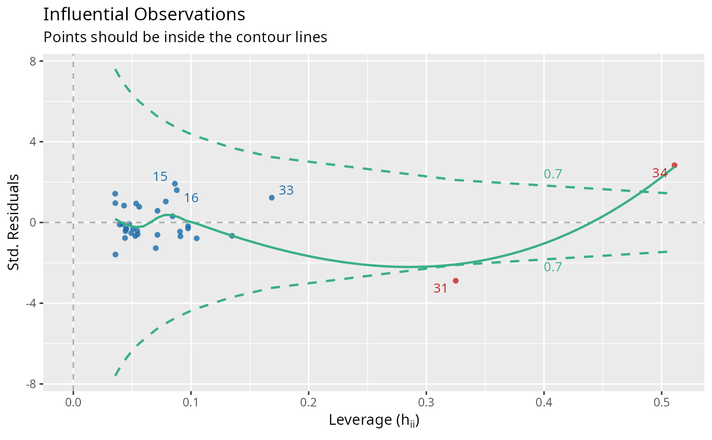 "dots"(default) for a scatterplot of leverage (hat) values versus residuals, with Cook's Distance contours for evaluating influential points."scree"for a scree-style plot highlighting "elbow outliers" (based on sudden increases in distance; see details)."bars"for a bar chart of (rescaled) outlier statistic values for each data point."count"for a "histogram"-style plot of outlier, where bins represent the outliers' distance values.