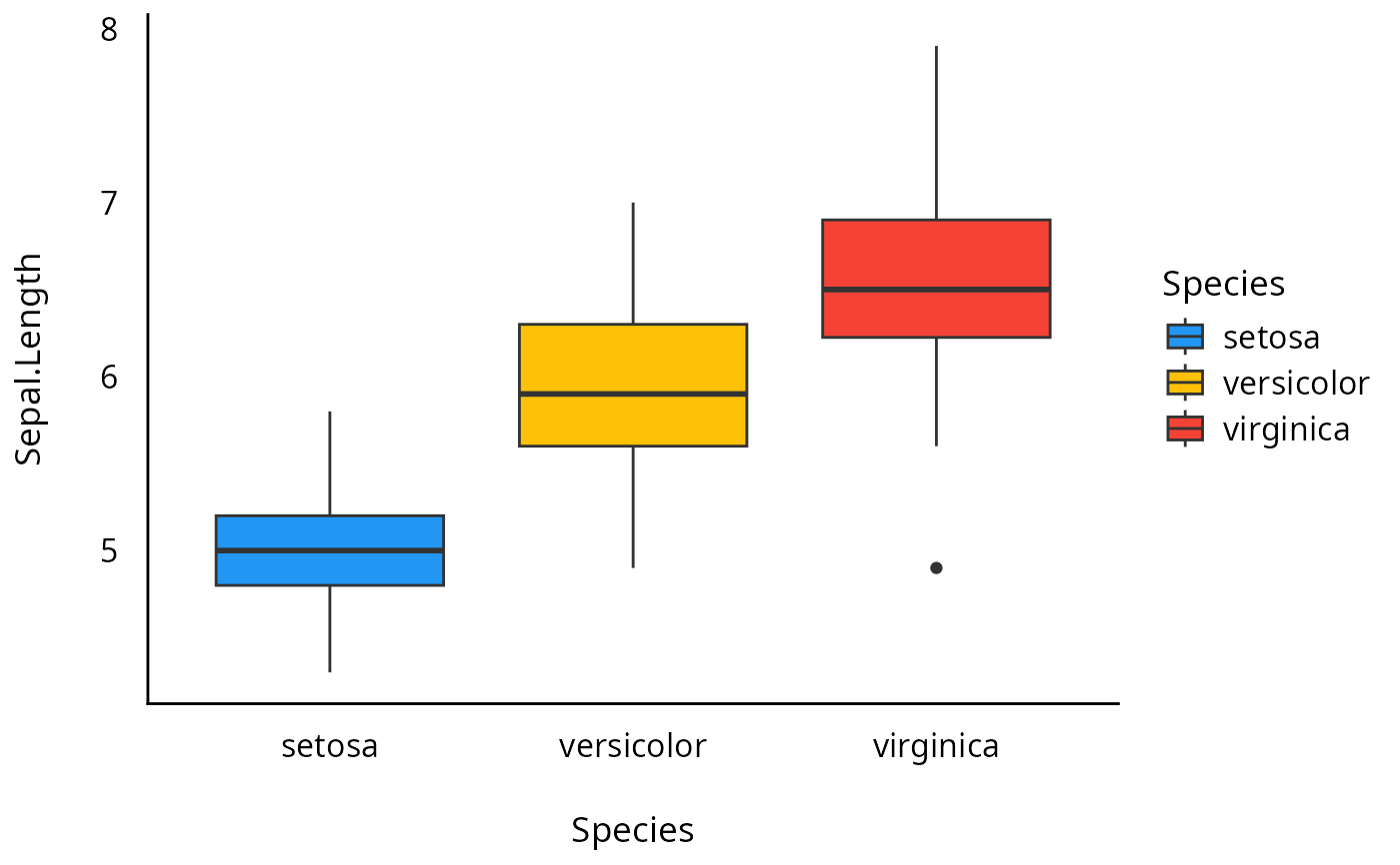 ggplot(iris, aes(x = Species, y = Sepal.Length, fill = Species)) +