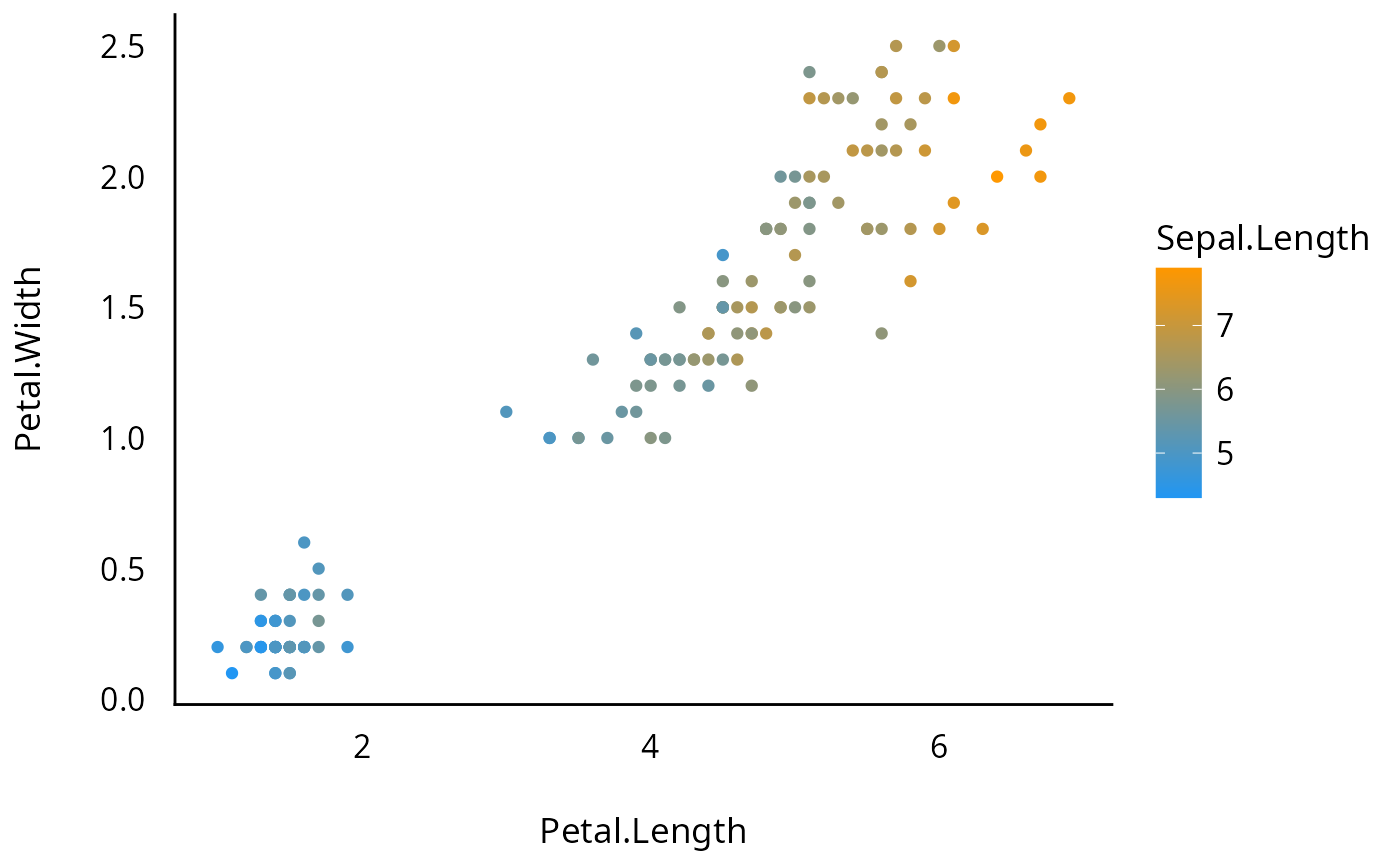ggplot(iris, aes(x = Petal.Length, y = Petal.Width, color = Sepal.Length)) +