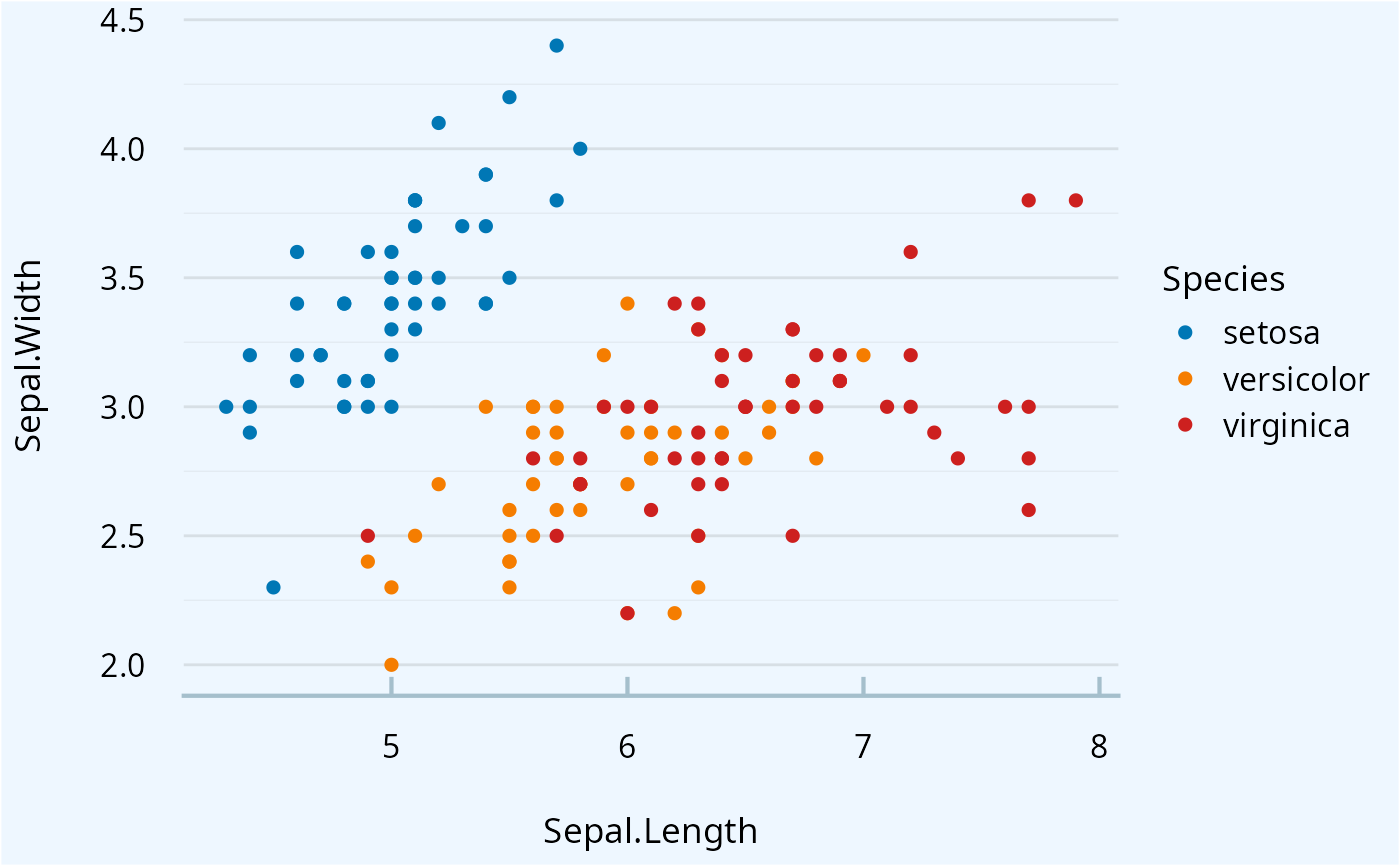 ggplot(iris, aes(Sepal.Length, Sepal.Width, colour = Species)) +