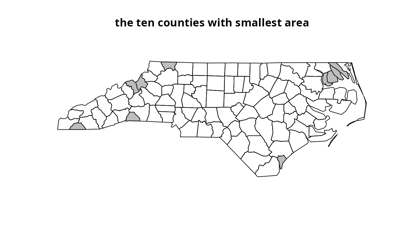 nc %>% select(AREA) %>% arrange(AREA) %>% slice(1:10) %>% plot(add = TRUE, col = 'grey')