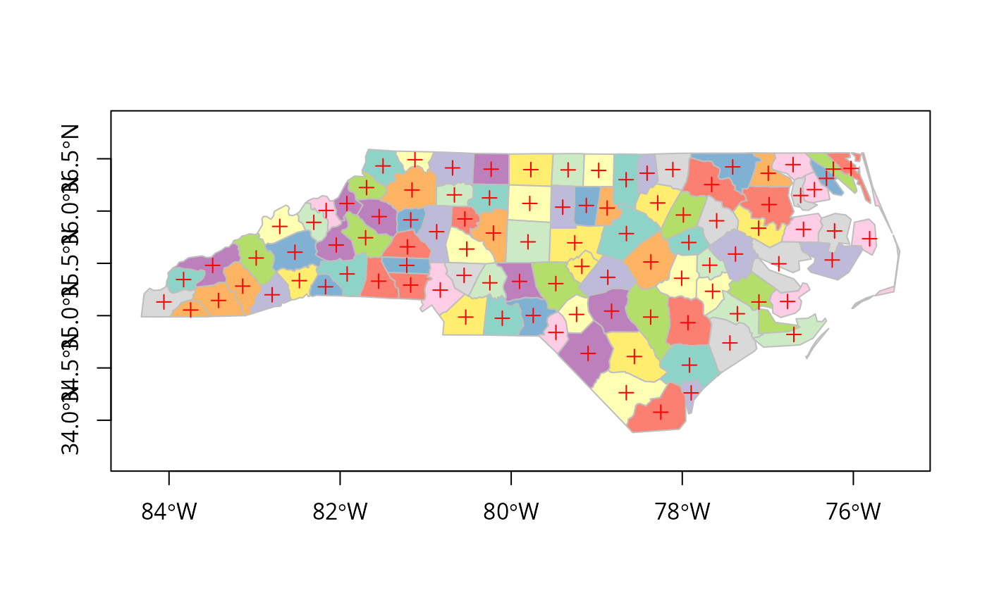 plot(st_geometry(st_centroid(nc)), pch = 3, col = 'red', add = TRUE)## Warning: st_centroid assumes attributes are constant over geometries