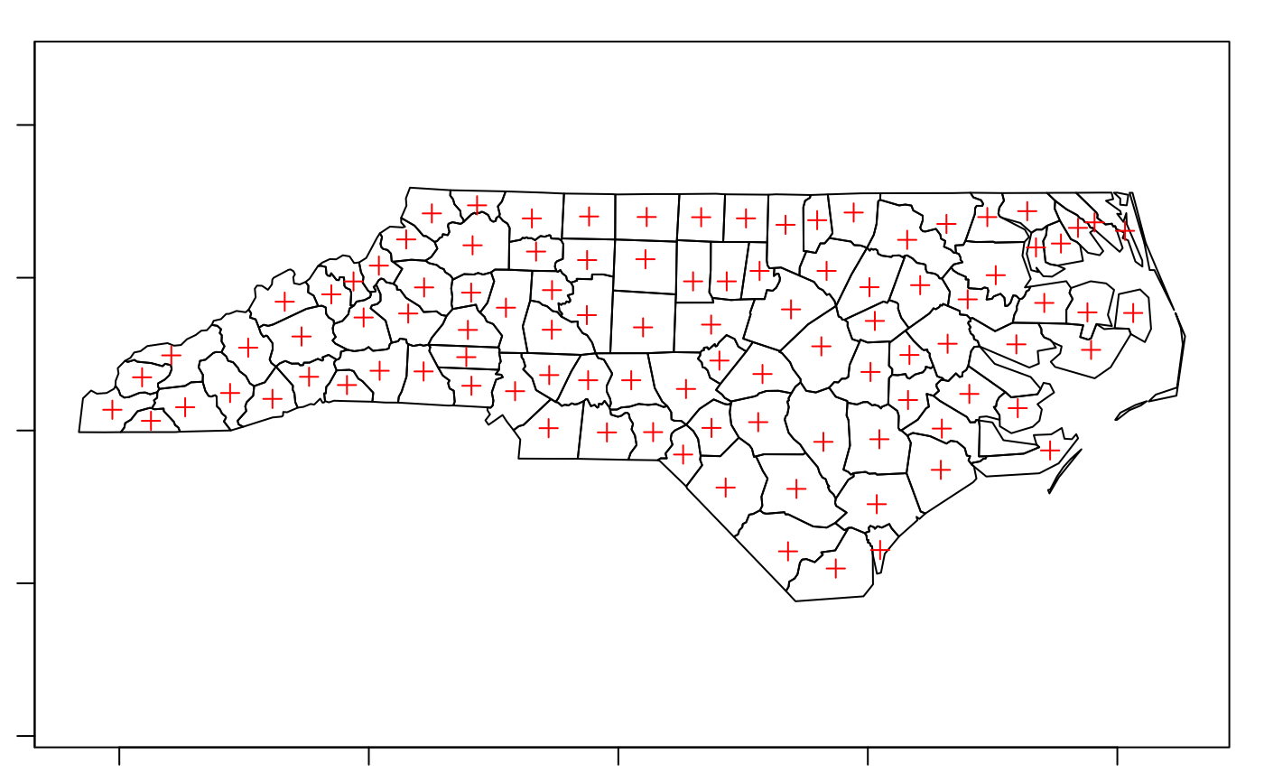 plot(st_centroid(nc_g), add = TRUE, pch = 3, col = 'red')