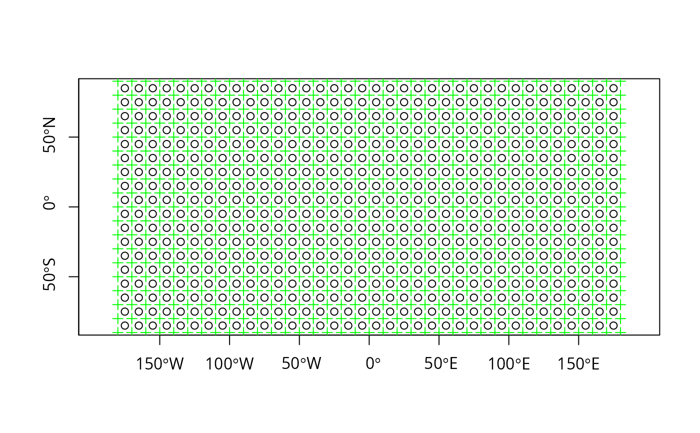 plot(st_make_grid(what = "corners"), add = TRUE, col = 'green', pch=3)