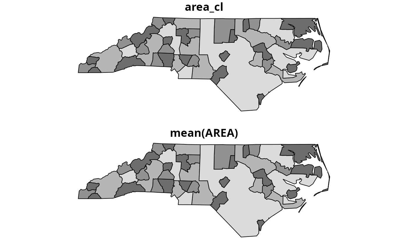 nc.g %>% summarise(mean(AREA)) %>% plot(col = grey(3:6 / 7))