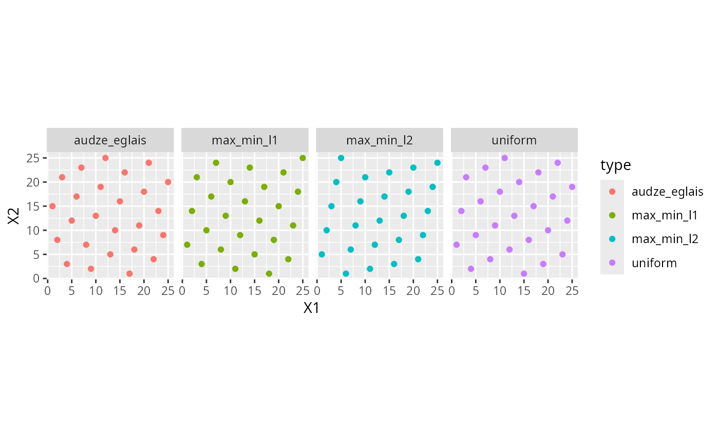 The available designs in this package are for experiments where the number of parameters ranges from two to ten of types "audze_eglais", "max_min_l1", or "max_min_l2". See Husslage et al (2011).