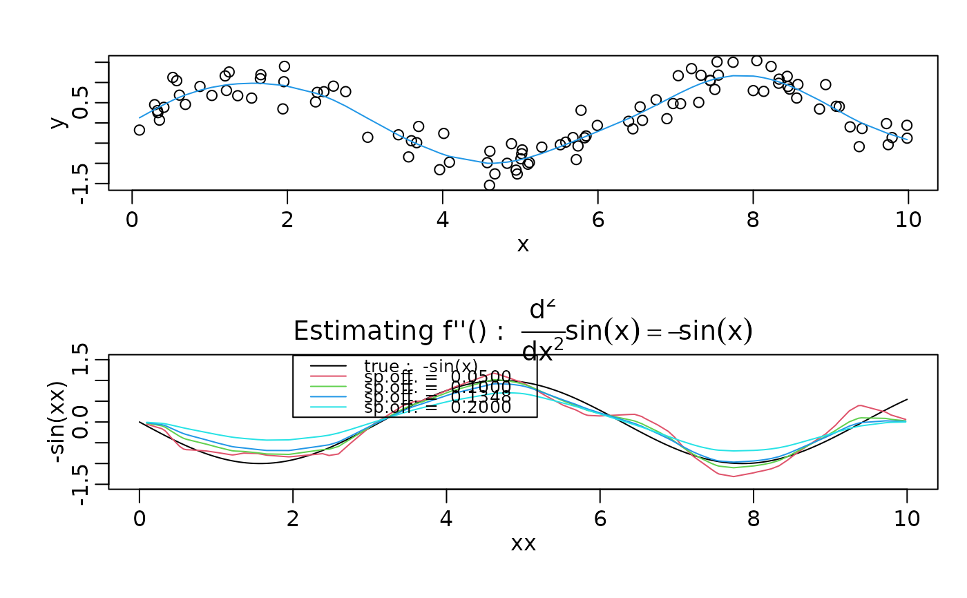 legend(2,1.6, c("true : -sin(x)",paste("sp.off. = ", format(offs))), lwd=1,