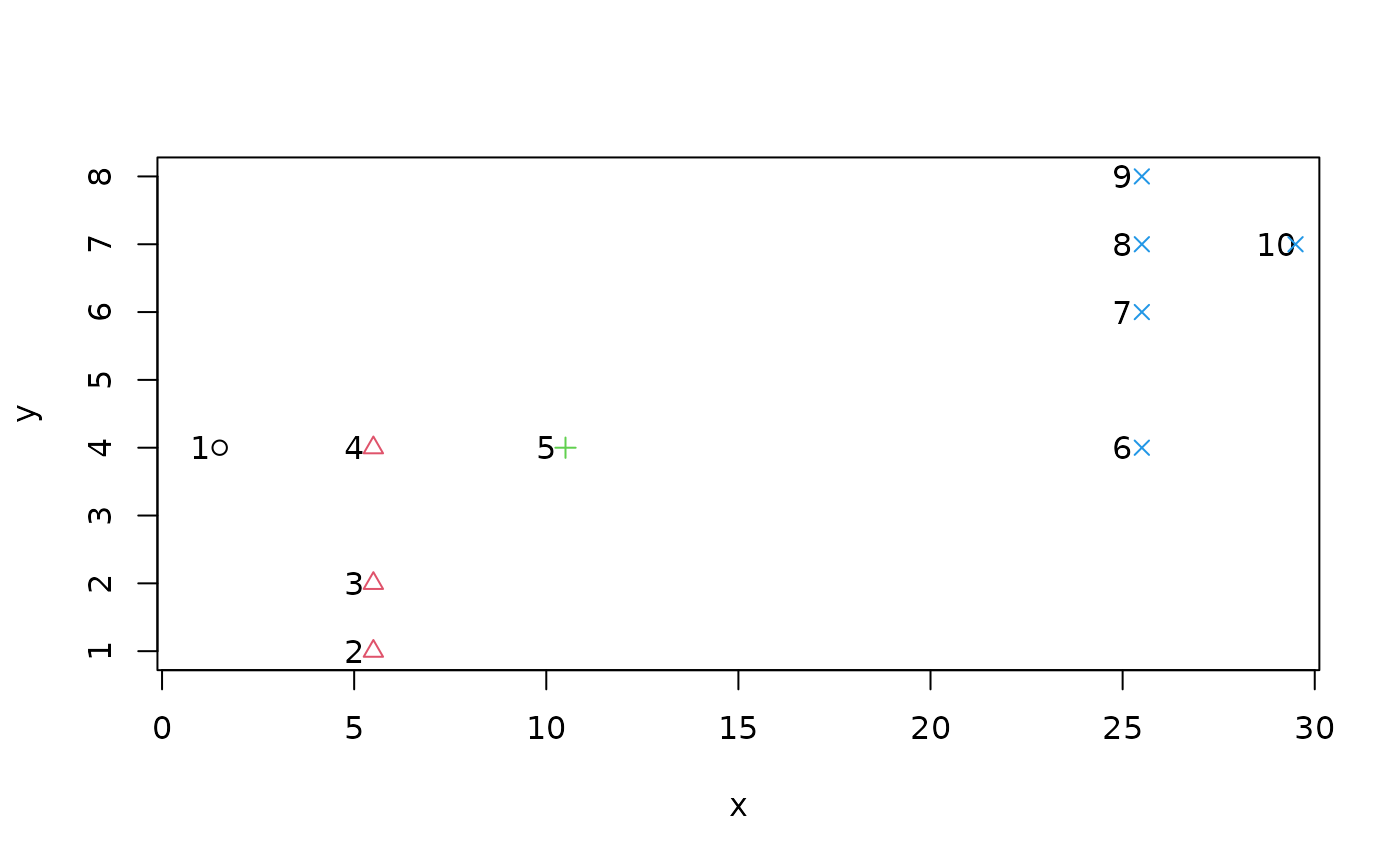 with(d1, points(x+0.5, y, col = cl1P, pch =cl1P))