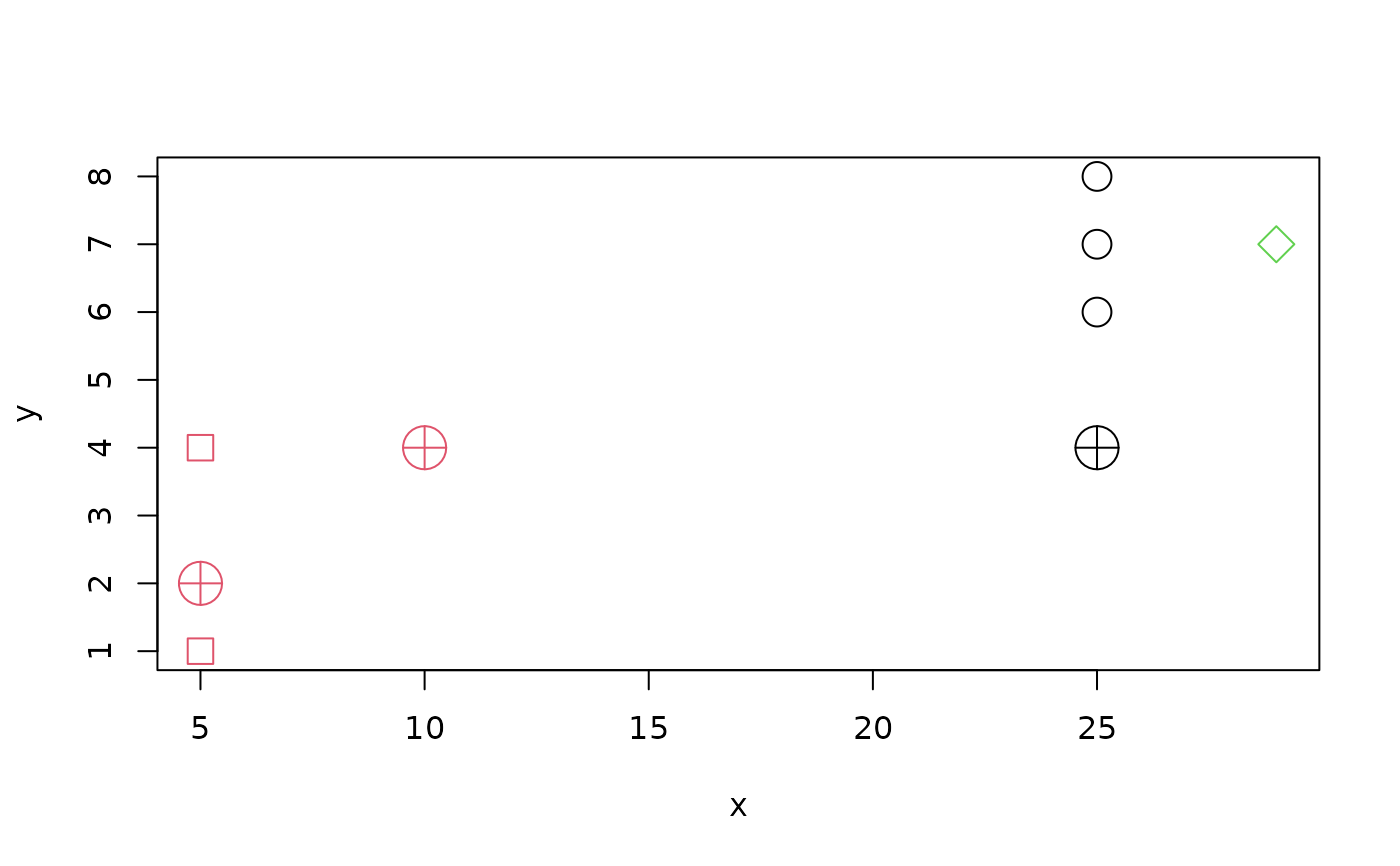 d1 <- data.frame(x = c(1, 5, 5, 5, 10, 25, 25, 25, 25, 29),