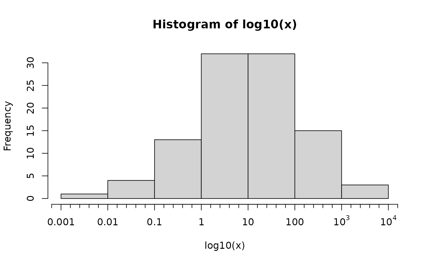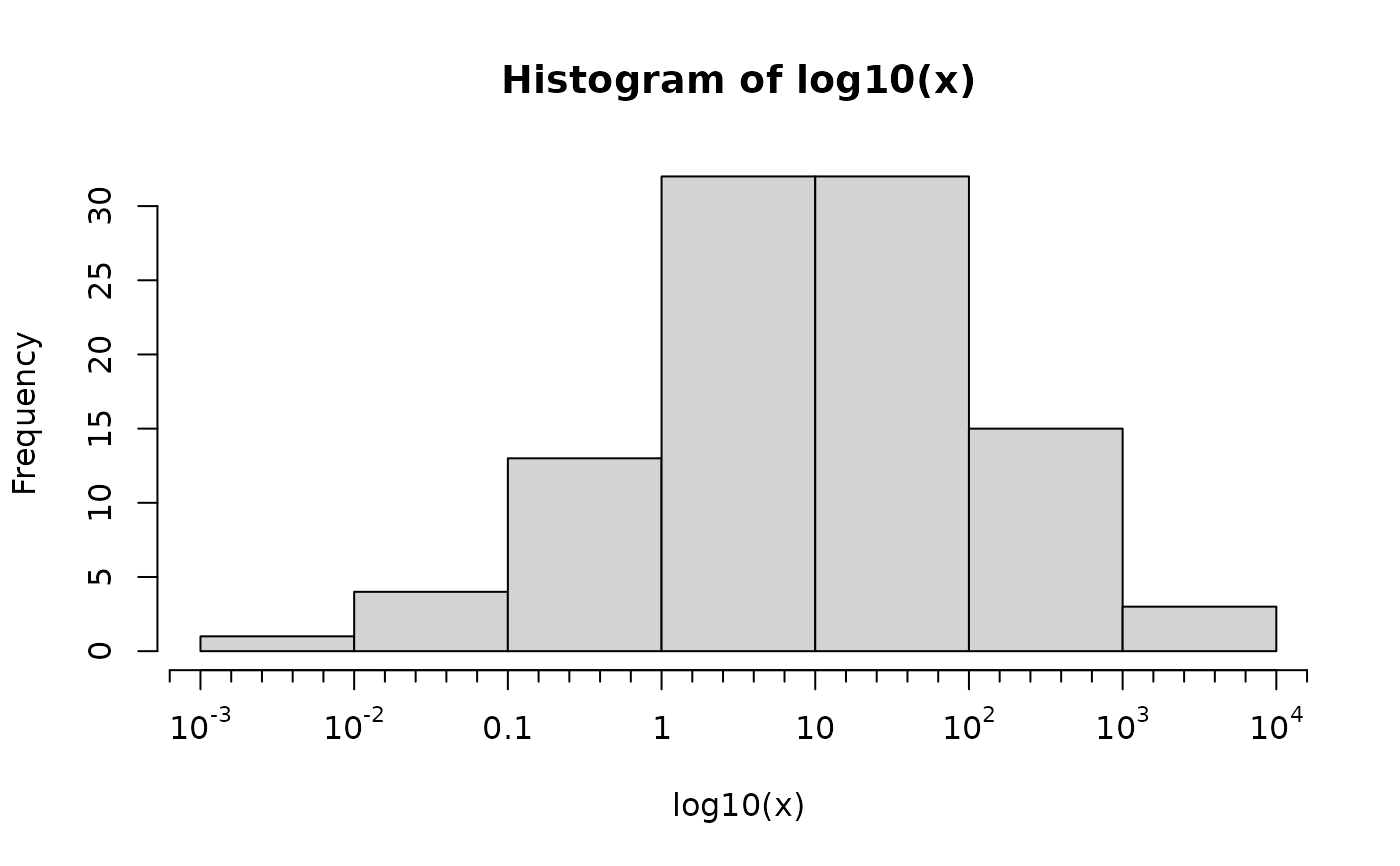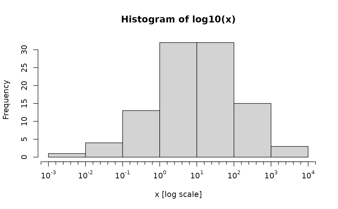 r <- hist(log10(x), xaxt = "n", xlab = "x [log scale]")