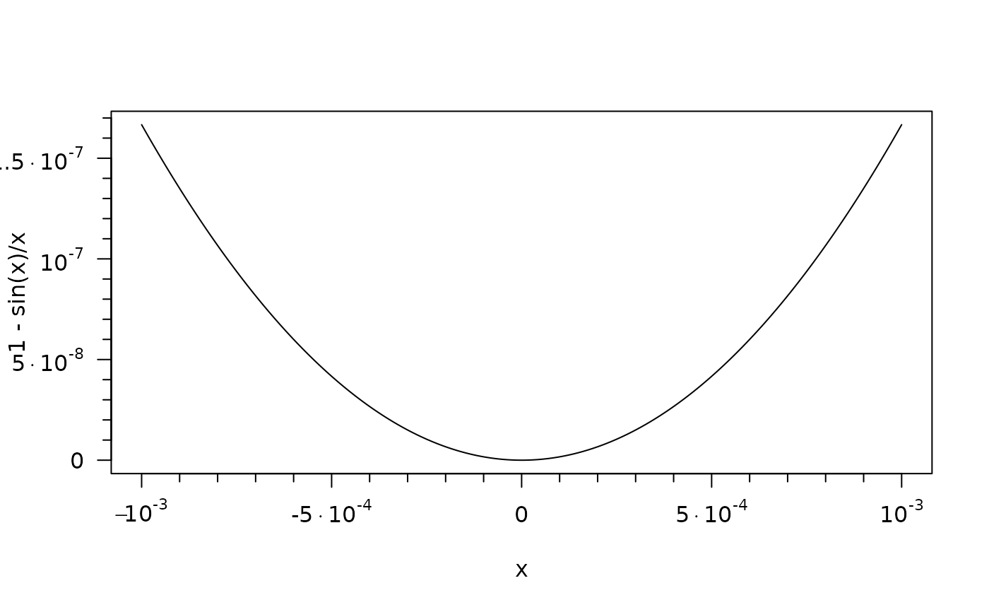 plot(x, 1-sin(x)/x, type = "l", xaxt = "n", yaxt = "n")