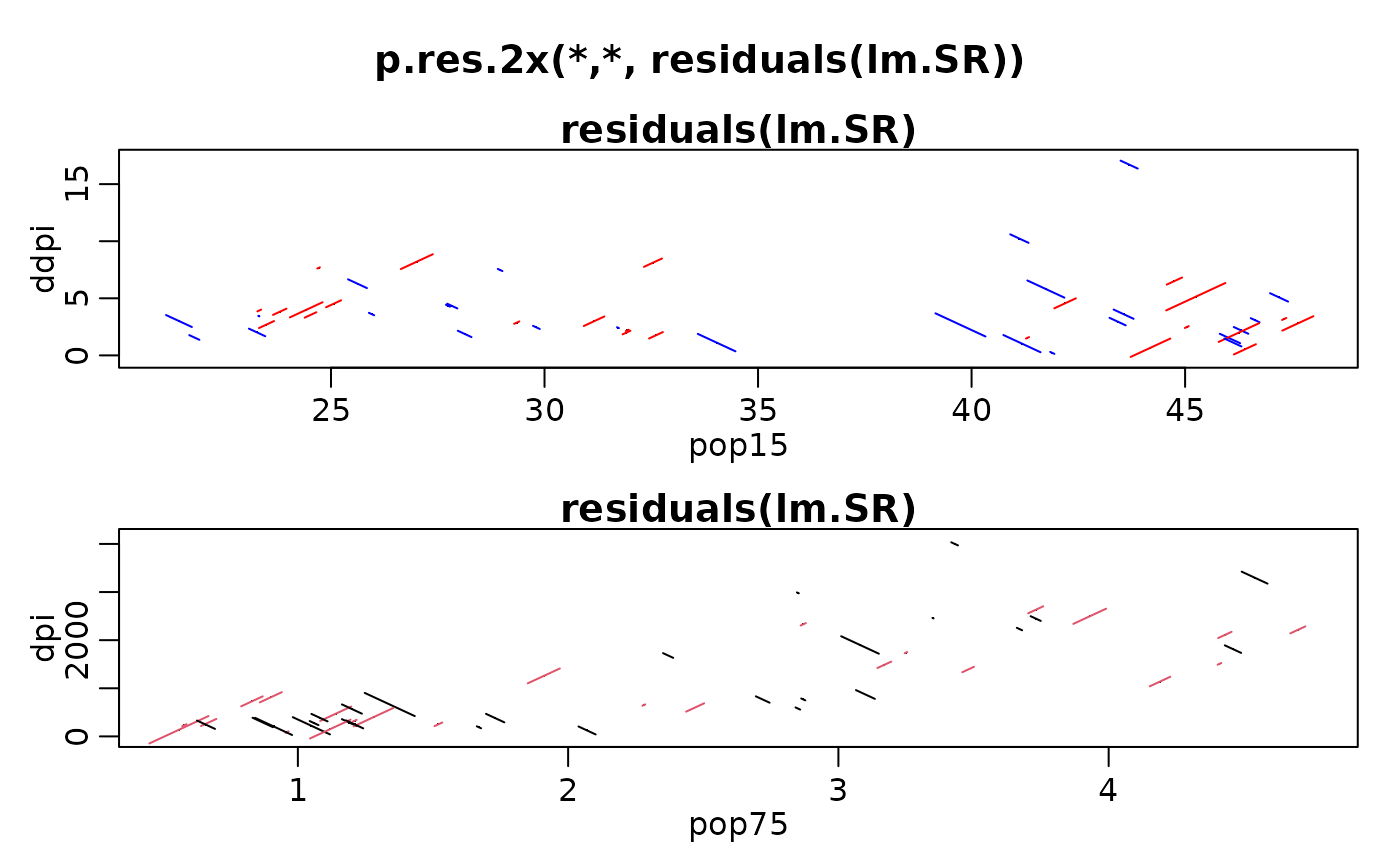 { p.res.2x(pop15, ddpi, residuals(lm.SR), scol=c("red", "blue"))