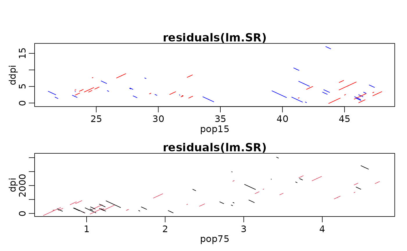 p.res.2x(~ pop15 + ddpi, lm.SR, scol=c("red", "blue"))