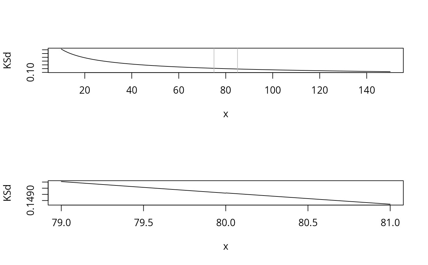 KSd.RdComputes the critical value for Kolmogorov-Smirnov's \(D_n\), for sample sizes \(n \ge 10\) and confidence level 95%.